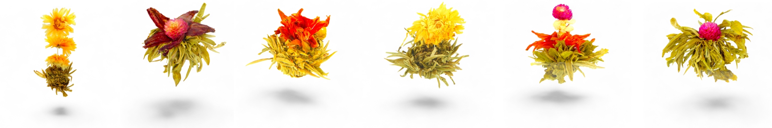 - Чотири квітучі чаї упаковані в декоративну картонну коробку, упаковані випадковим чином із тих, що показані нижче,