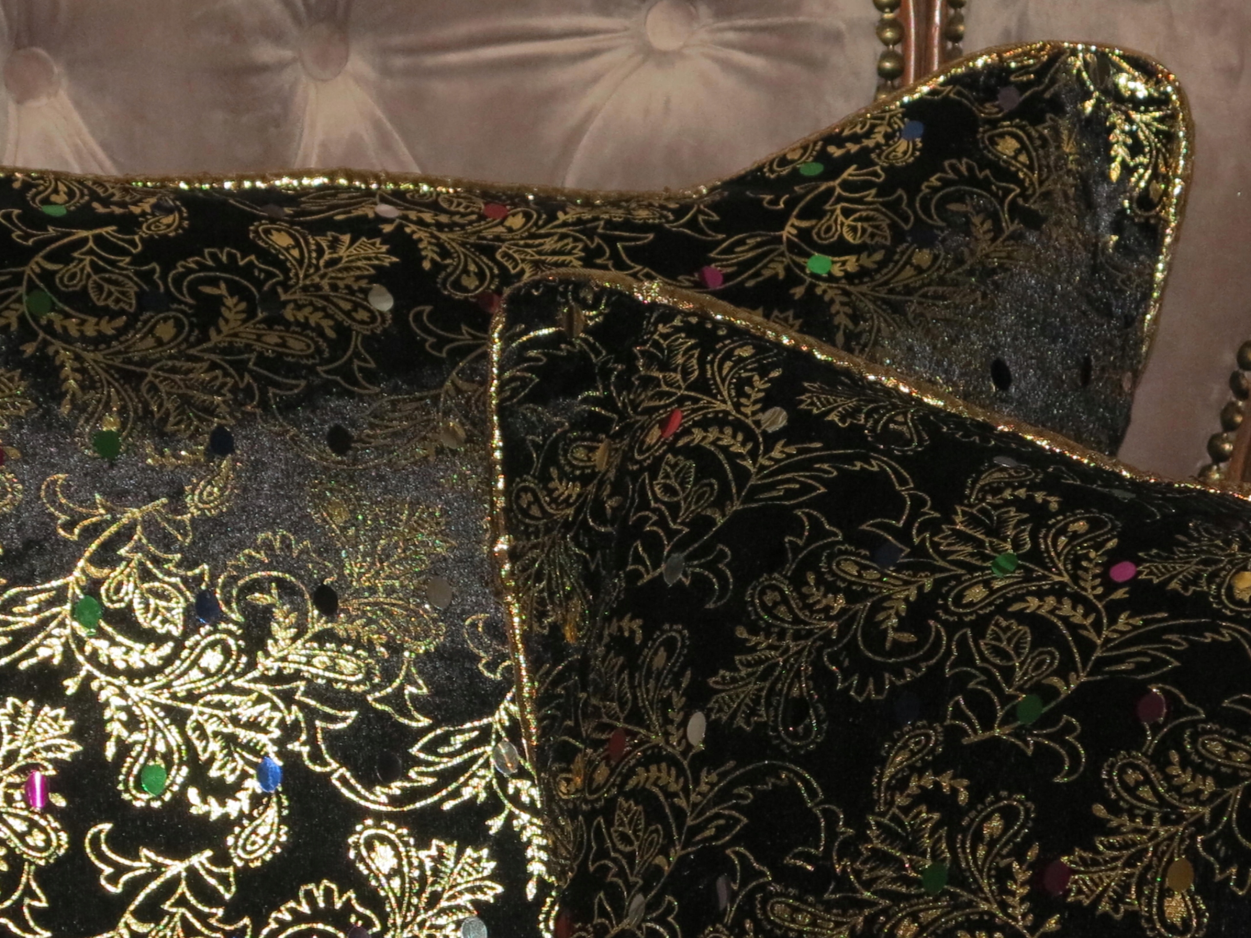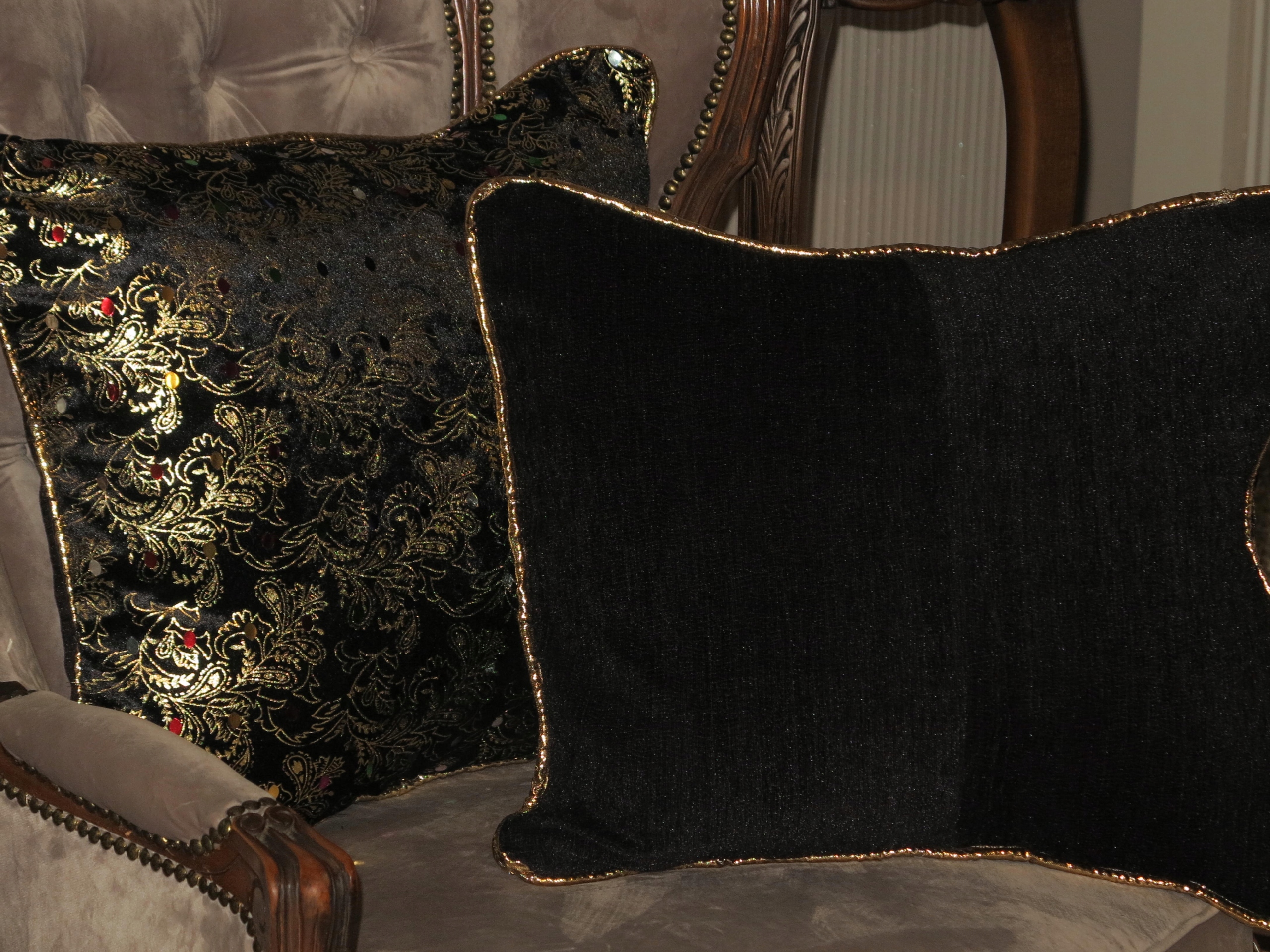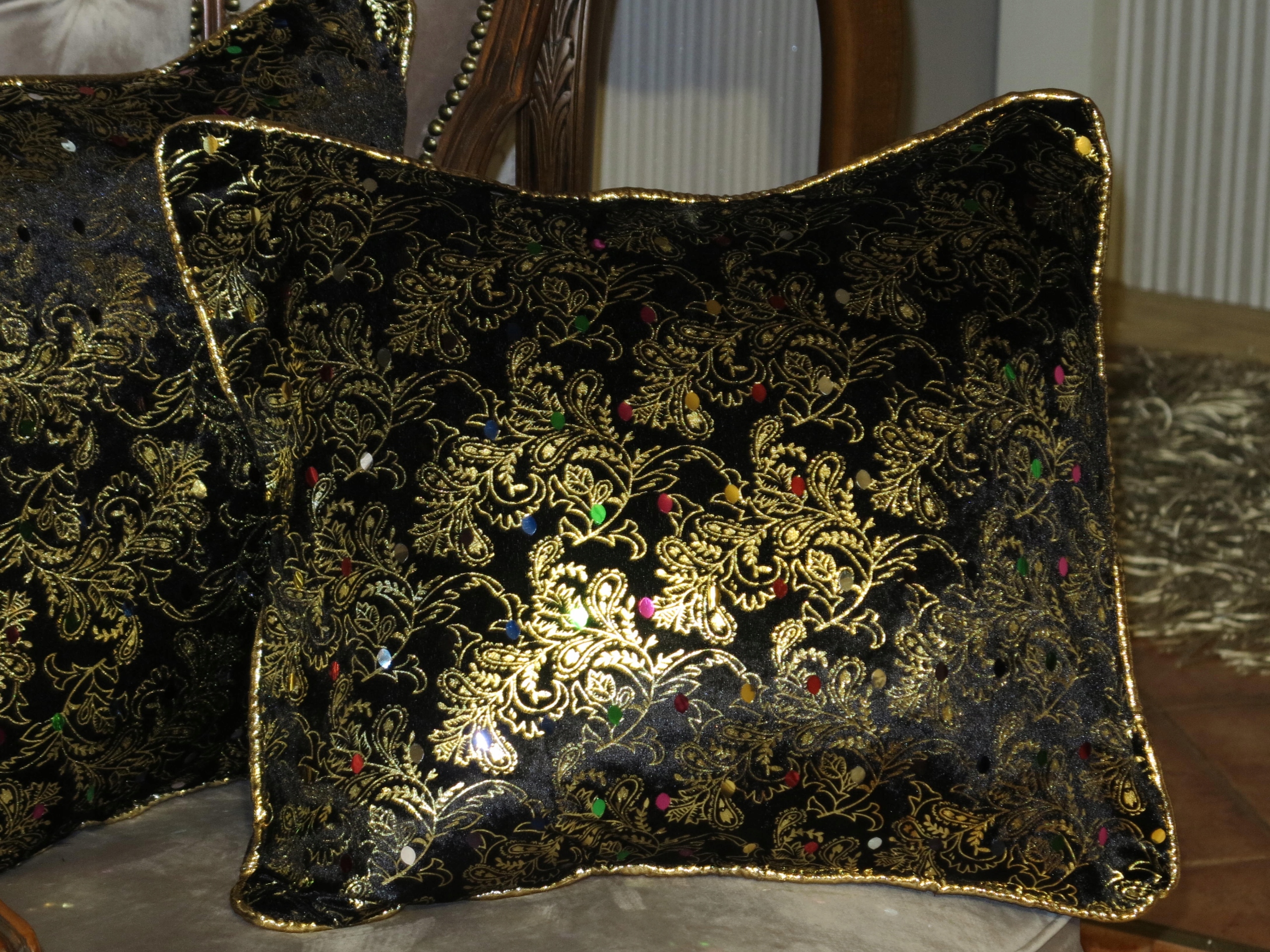 ЕКСКЛЮЗИВНОГО ТА ВИНЯТКОВОЇ КРАСИ НАБІР ВЕЛИКИХ І ТОВСТИХ НАВОЛОЧОК Z ПУХНАСТИЙ ВЕЛЮРОВИЙ ОКСАМИТ ЧОРНОГО КОЛЬОРУ, З БАГАТО ПОЗОЛОЧЕНИМИ ВИЗЕРУНКАМИ.