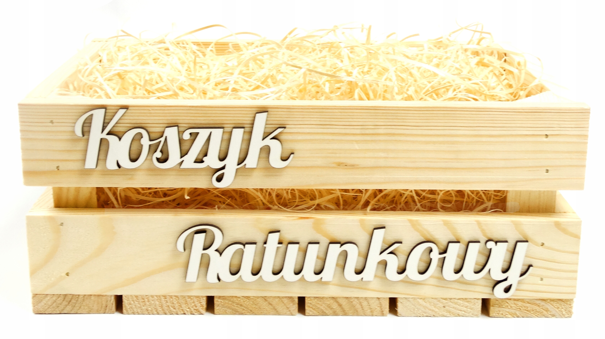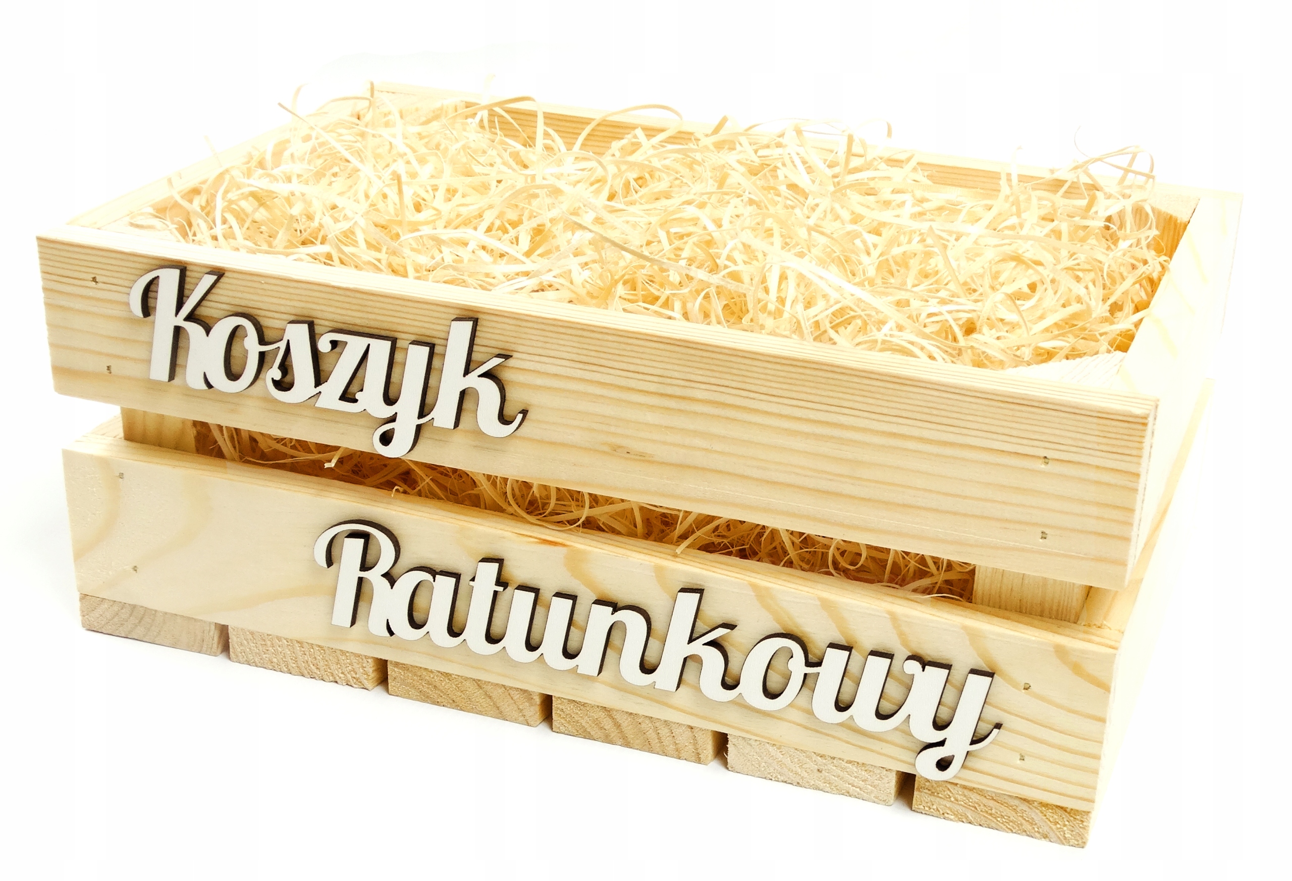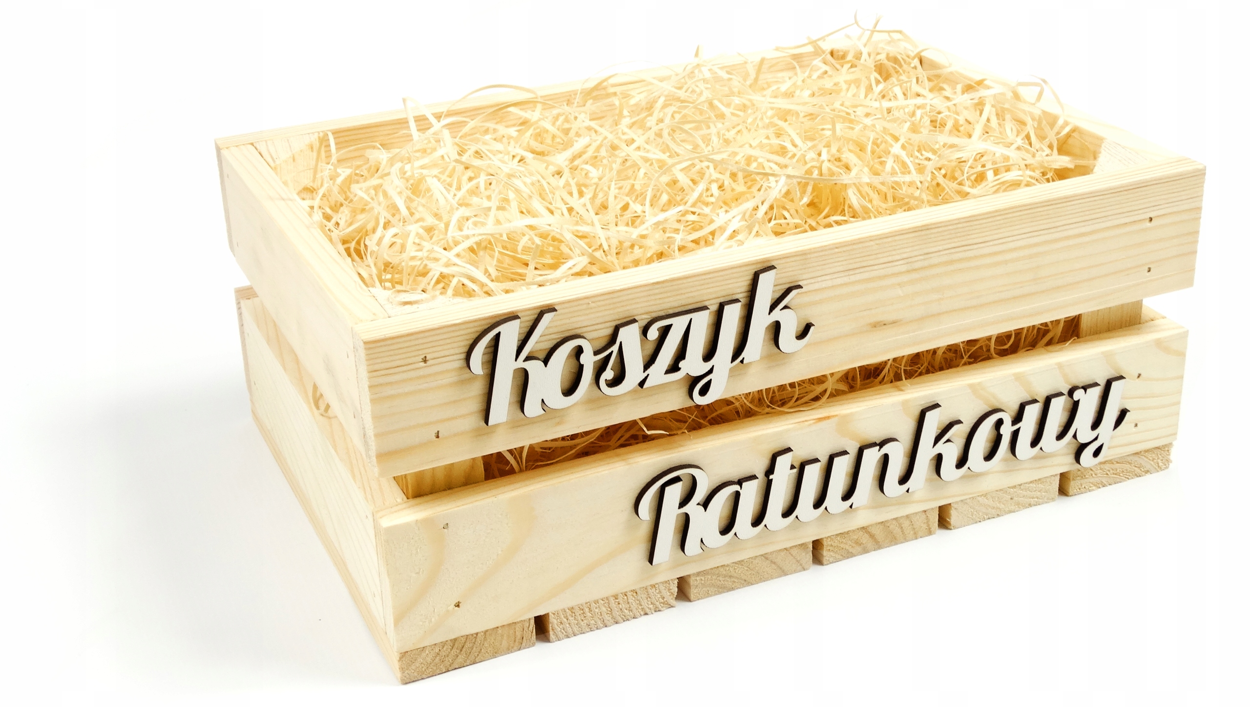 Дерев'яна коробка натурального кольору з білим написом "Rescue basket". Маст-хев кожного весілля, який неодмінно допоможе вашим гостям подолати кризові ситуації.