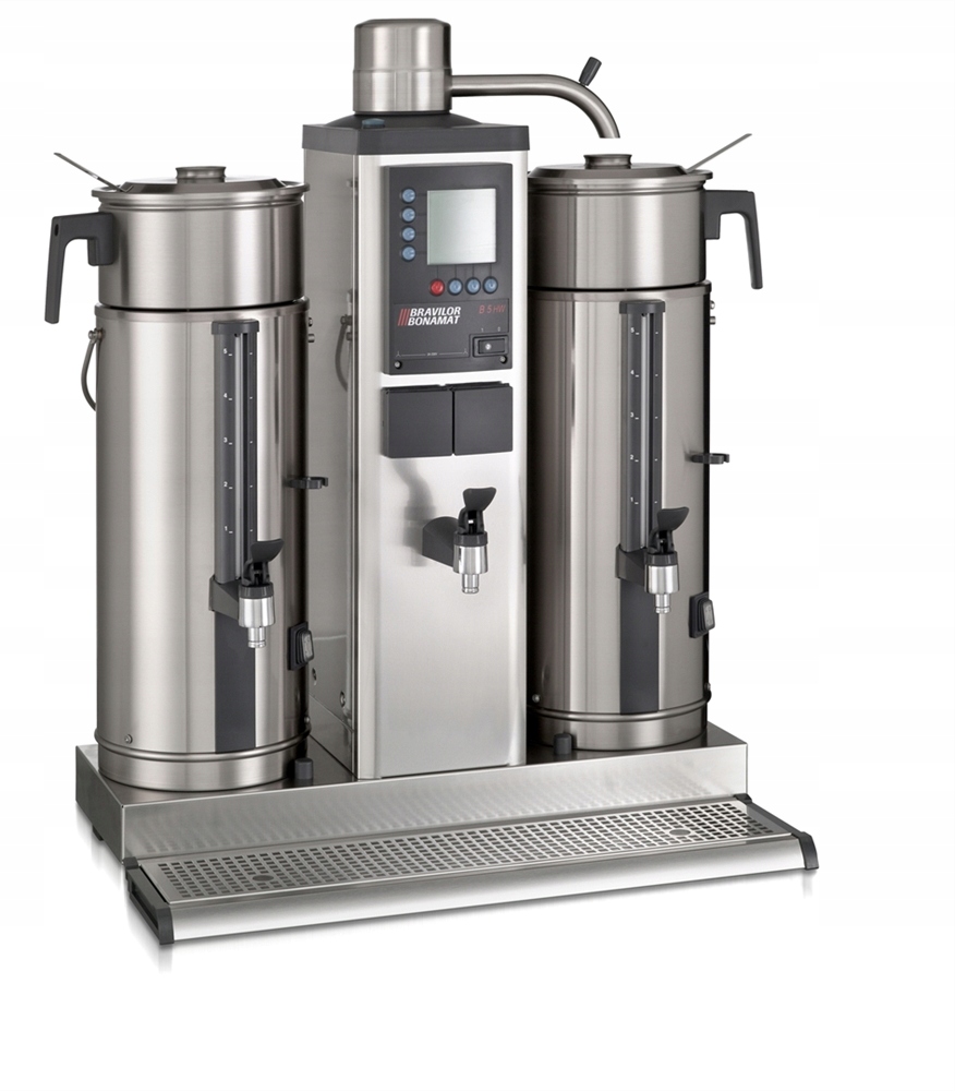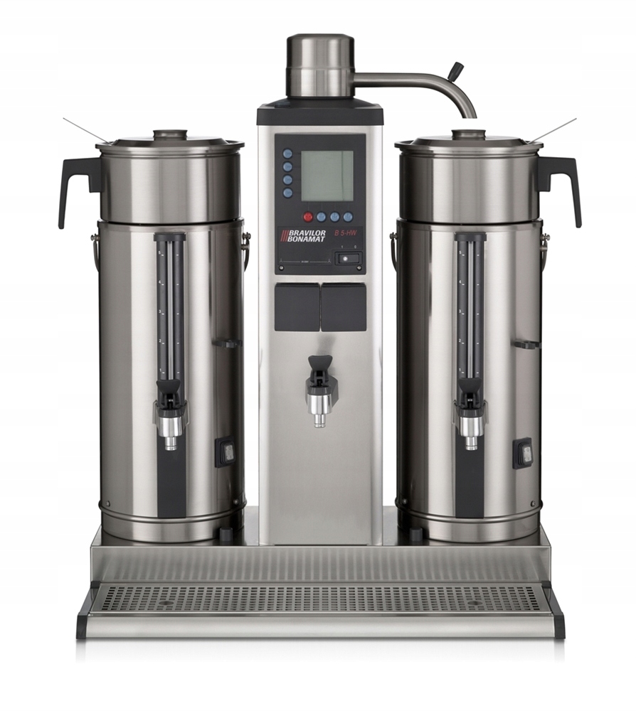 Якщо вам також потрібна гаряча вода, крім кави, ідеальним рішенням буде серія B HW. Пристрої цієї серії оснащені окремим краном гарячої води, що дозволяє, наприклад, пивоварний чай. Ця серія включає три версії: 5, 10 та 20 літрів. Як стандарт, пристрої серії B (HW) складаються з стовпця та двох термозів, але є також версії з одним термосом, розташованим зліва або з правого боку стовпця. Це дозволяє легко поєднувати, наприклад, два -три пристрої, щоб заварити ще більшу кількість кави. Ми пропонуємо ряд моделей, адаптованих до різних потреб. Безпека також відіграє ключову роль у таких великих машин. Побудовані системи безпеки гарантують, що кава не буде заварена, якщо термос і стяжки не розміщуються нижче обертового стяжки. РК -дисплей, щоденний та колективний лічильник, система пониження, "Кава готова", побудований таймер та оптимальний захист. Набір включає: стовпчик із краном гарячої води, термос (и) типу нержавіючої сталі VHG, кошик (i) для фільтрів, основи та зливника. Переповнене