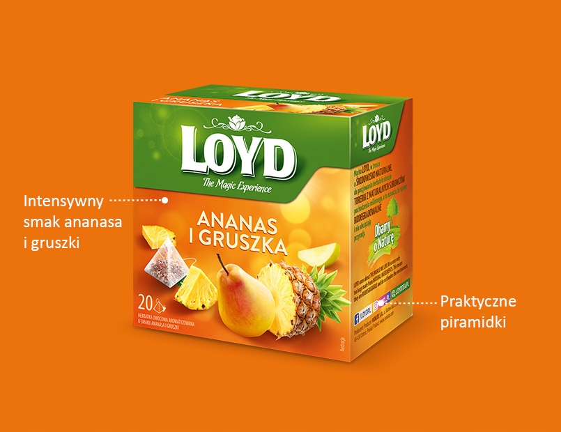 У лінійці фруктового чаю LOYD ви знайдете широкий асортимент чайних композицій на основі садових і лісових фруктів, а також екзотичних фруктів b>. Правильно підібрані пропорції інгредієнтів створюють чаї, які захоплюють не тільки любителів класики, а й любителів нетрадиційних смакових поєднань.Фруктові чаї LOYD в пакетиках-пірамідах створені для любителів справжніх фруктових смаків, а готуютьсяз них настій набуває насиченого кольору, чудового аромату та незвичайного смаку.Дізнайтеся, чи ви віддаєте перевагу пити його як гарячий настій чи як освіжаючий напій, наприклад, з льодом.