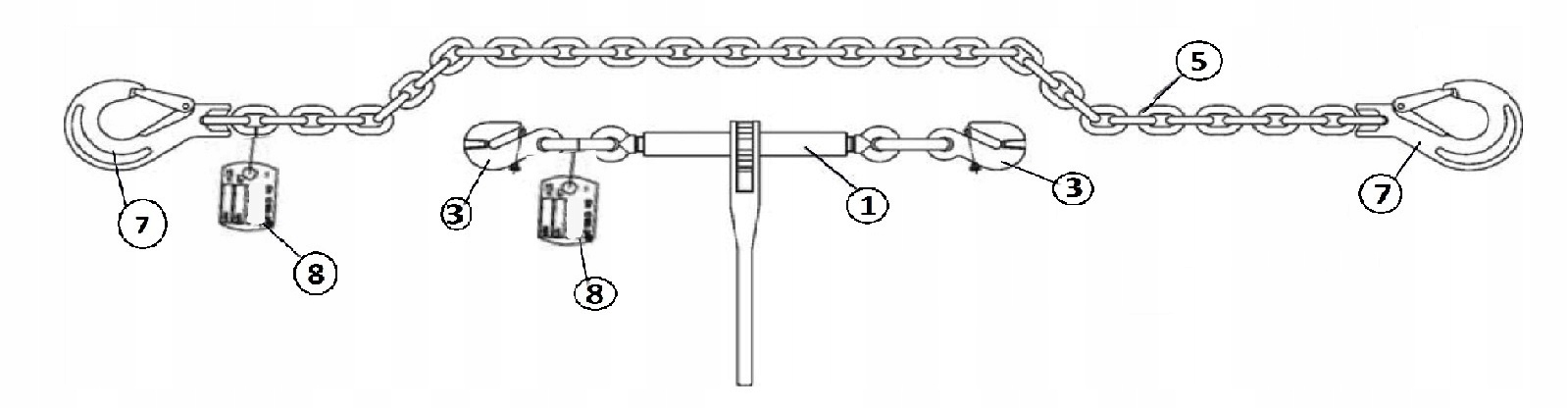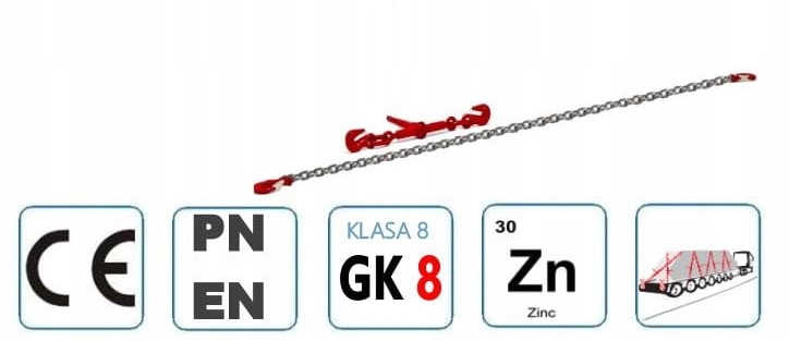 Напружники в нашому вилученні ланцюга відповідають EN-PN 12195-3, а спеціальна конструкція гачка вкорочення значно продовжує час роботи ланцюга. Кожен натягувач має точне маркування: