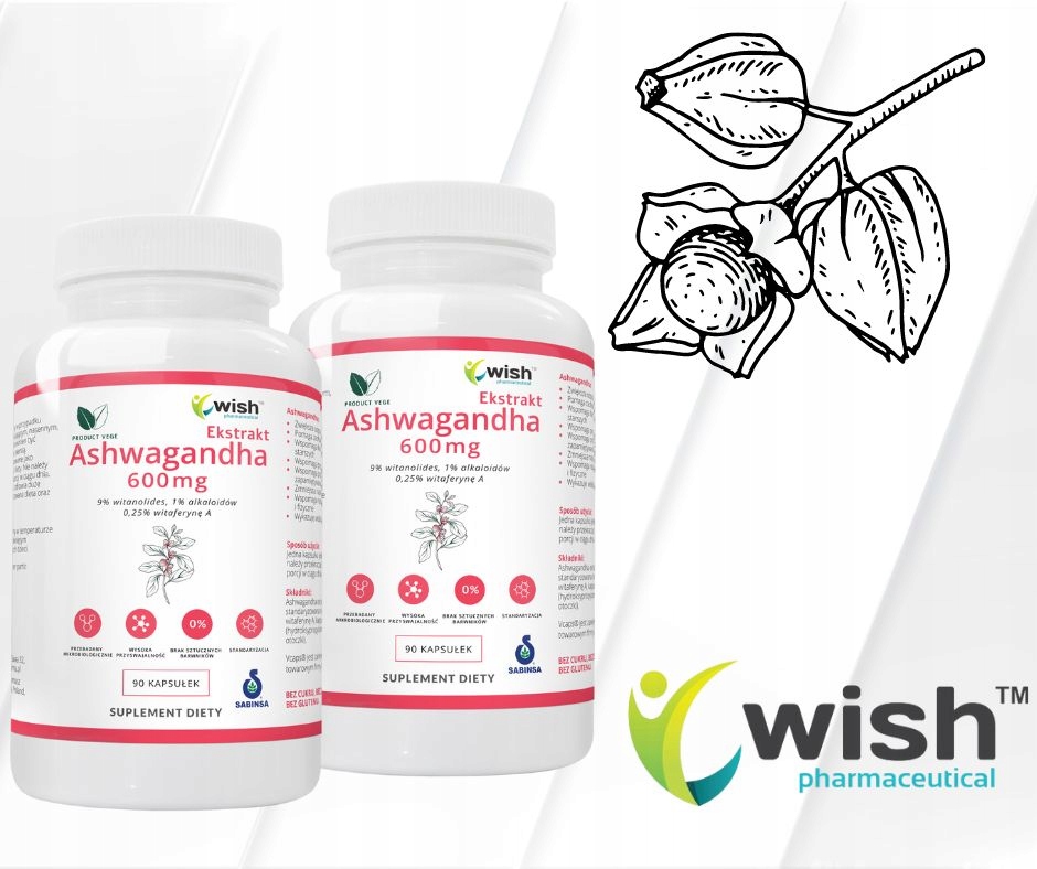 - Ашваганда від WISH Pharmaceutical базується на сировині відомої корпорації Sabinsa Corporation, постачальника рослинних екстрактів, мінералів, функціональних інгредієнтів для фармацевтичної промисловості та дієтичних добавок. Компанія поєднує в собі принципи традицій, інновацій та досліджень, щоб надати альтернативні натуральні продукти.
