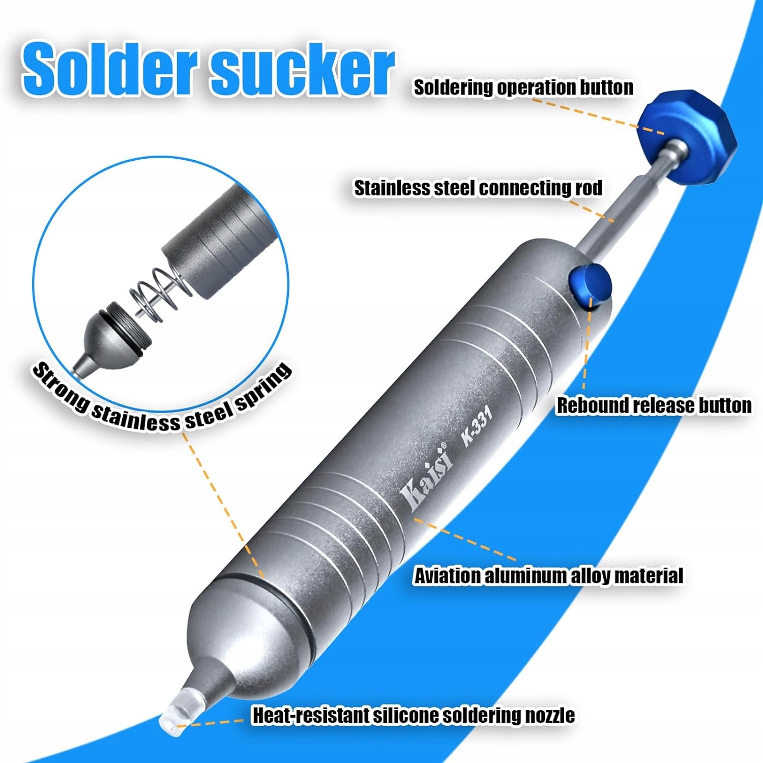 Екстрактор олова використовується для видалення сполучної речовини припою та відпаювання електронних компонентів. Пилосос характеризується високою потужністю всмоктування, малою вагою, високою міцністю і стійкістю до високих температур. Аспіратор має поршень з ущільнювачем і алюмінієвий корпус, що забезпечує тривалу роботу. Тефлоновий наконечник PTFE, антистатичний.