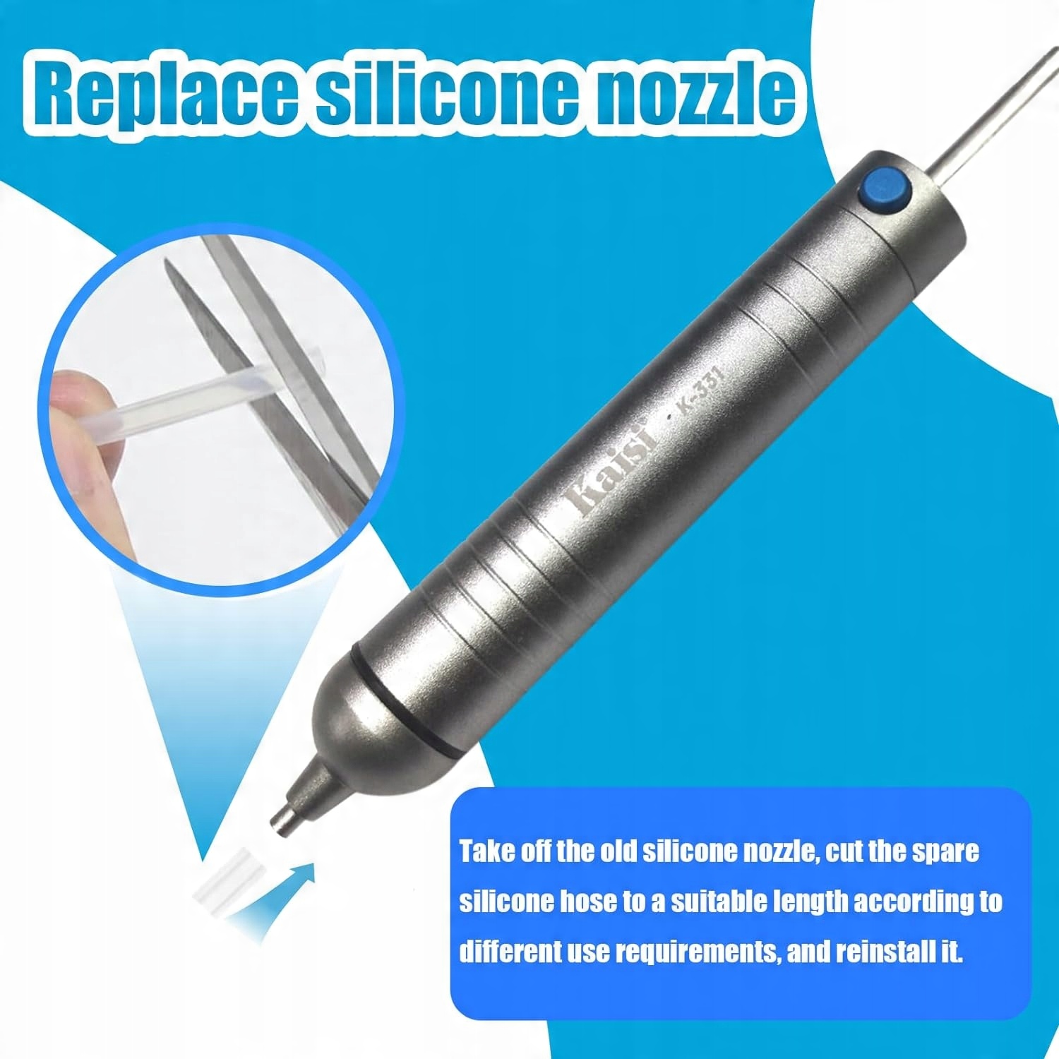 Екстрактор олова використовується для видалення сполучного припою та розпаювання електронних компонентів. Пилосос характеризується високою потужністю всмоктування, малою вагою, високою міцністю і стійкістю до високих температур. Аспіратор має поршень з ущільнювачем і алюмінієвий корпус, що забезпечує тривалу роботу. Тефлоновий наконечник PTFE, антистатичний.