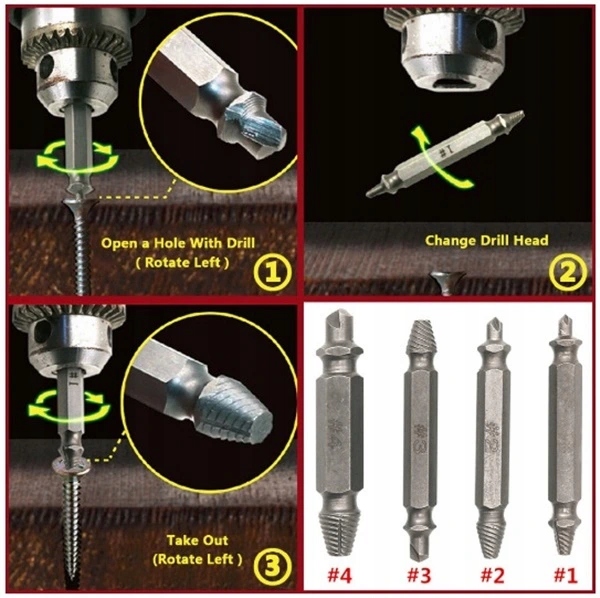 - ВИСОКА ЯКІСТЬ - екстрактори виготовлені зі сталі, в комплект входить 4 різних розміру, які ідеально впораються з гвинтами різного розміру