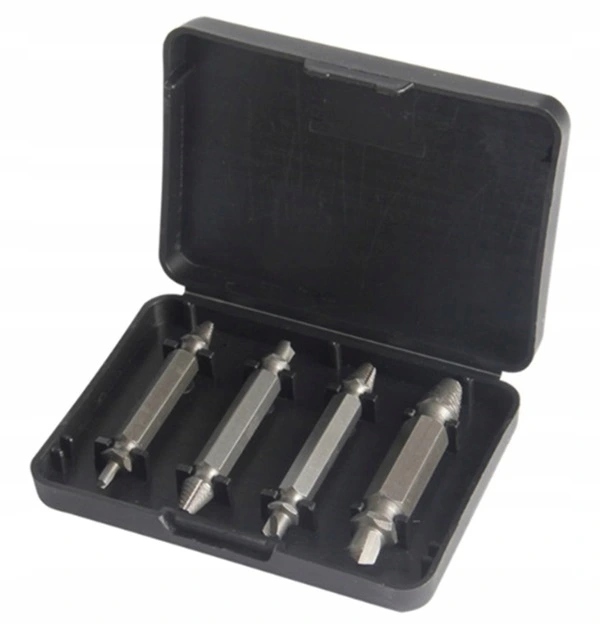 Щоб видалити несправний гвинт, вам знадобиться дриль - 10 секунд достатньо, щоб позбутися проблеми. У набір входять чотири екстрактори різного розміру.діаметрів, що дозволяє витягувати шурупи різного розміру.