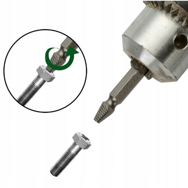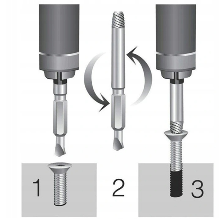 Витягувачі зламаних гвинтів дуже прості у використанні. Використовуються для видалення стандартної різьби. Якщо гвинт пошкоджений/зламаний, просвердліть його симетрично посередині, а потім закрутіть знімач гвинтів відповідного розміру для зламаних гвинтів. Переміщення (поворот) знімача зламаного гвинта вліво призводить до повільного відкручування зламаного гвинта. Продовжуйте повертати екстрактор, доки пошкоджений гвинт не буде повністю видалено.