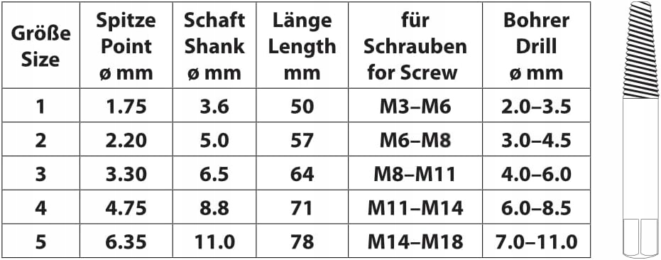 - з попередньою колічною ниткою для легкого та швидкого видалення, торгівлі. іржаві або використані болти (M3 до M18), шпильки та металеві дюбелі