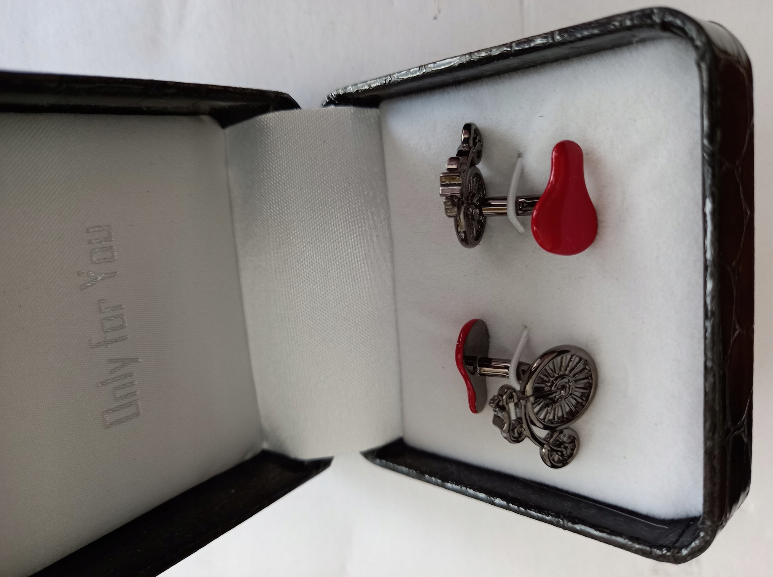 Цікаві та дуже оригінальні манжети для сорочок -у формі манжети у формі велосипеда найстаріший ретро -велосипед. Зазюки виготовлені з дорогоцінного металу і пофарбовані барвистими акриловими емалами. Набір запонів упакований у чудову приємну захоплюючу коробку. Ідеально підходить для цікавого та чудового подарунка; велосипедист, велосипедист або турист.