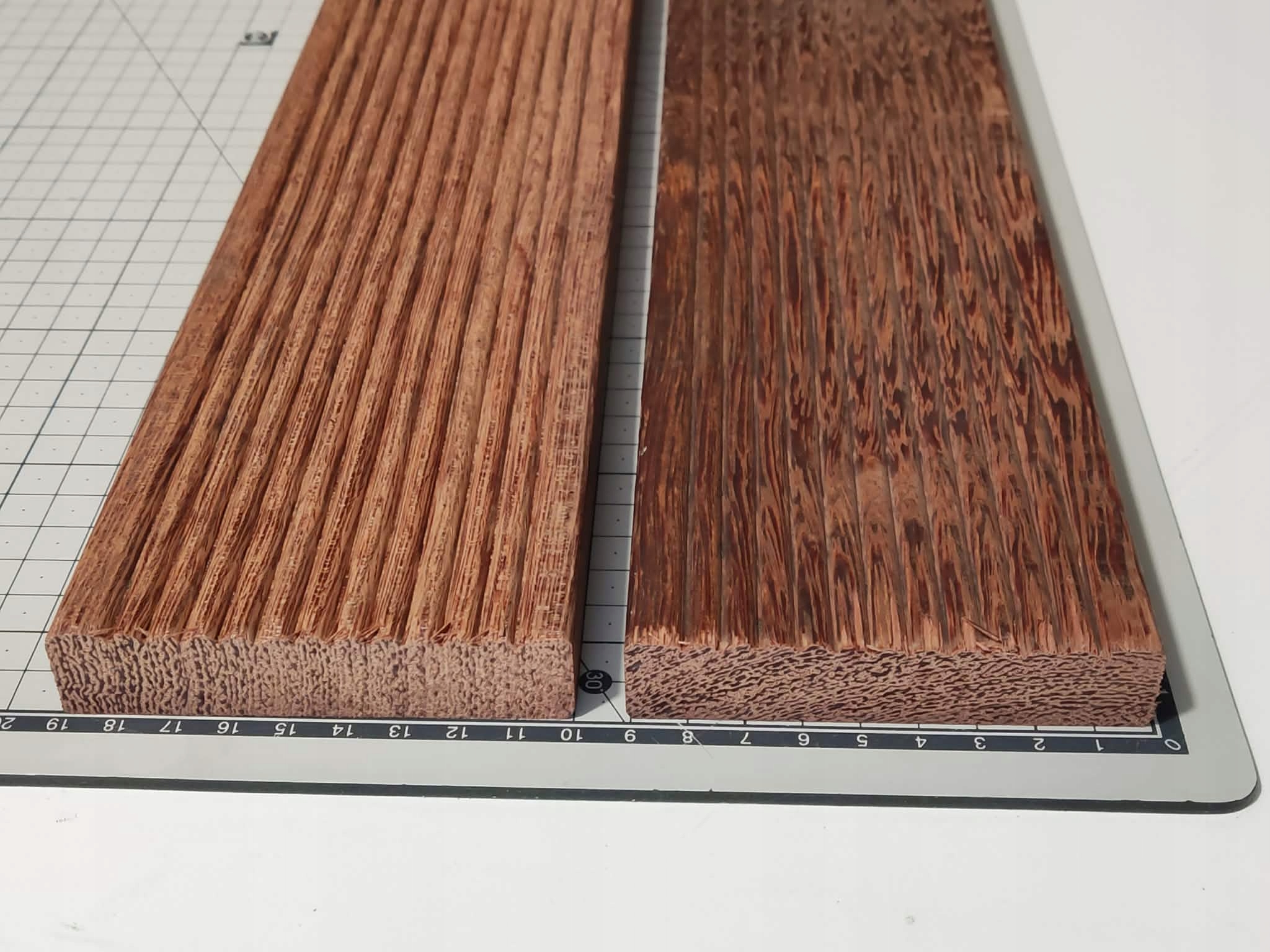 На фотографії нижче показано зразок товарів, що продаються, шматок дерева зверху знаходиться в необробленому стані, шматок дерева знизу, половина вистругана, а інша половина вистругана та змащена маслом.
