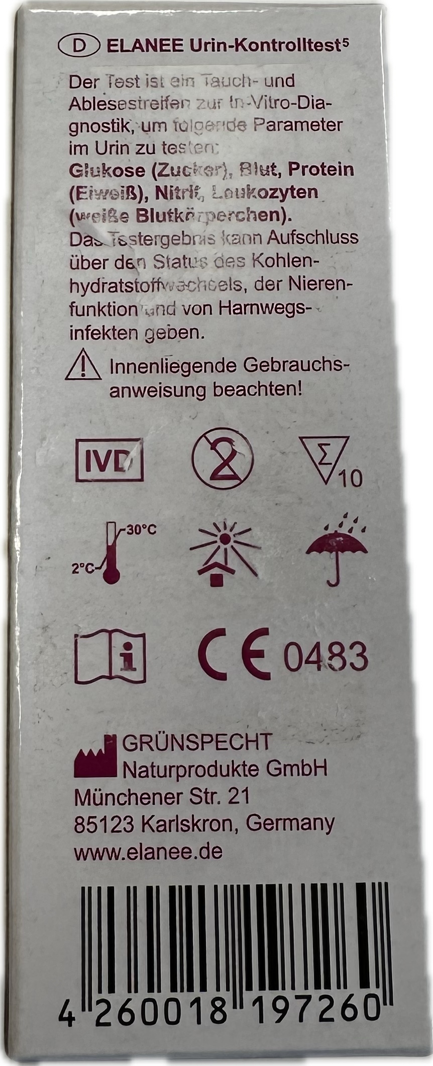 Elanee Urine Control Test 5 — це діагностична смужка для занурення та зчитування in vitro для перевірки таких параметрів сечі: глюкоза (цукор), кров, білок, нітрити та лейкоцити (білі кров’яні клітини). Результат тесту може надати інформацію про стан вуглеводного обміну, функцію нирок та інфекції сечовивідних шляхів.