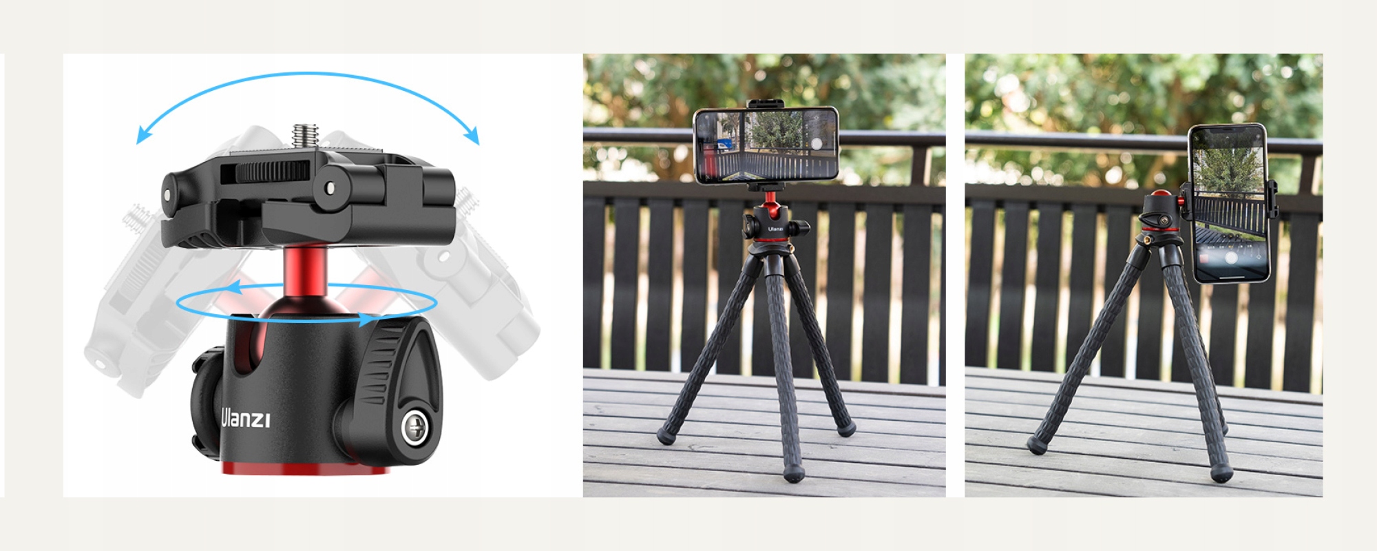 Гнучкий штатив Ulanzi MT-33 оснащений точною головкою кулі, яка дозволяє швидко встановити ідеальну рамку, чи ви фотографуєте вертикально чи горизонтально. Завдяки цьому ви можете легко зробити селфі, записувати влог або підготуватися до відеоконференції, навіть коли ви обмежені космосом. На штативі ви додасте як камеру (1/4 нитки "), так і смартфон (ручку). Повна свобода коригування означає, що обладнання завжди адаптується до вашого стилю роботи, а не навпаки. Ширина від 60 до 85 мм.