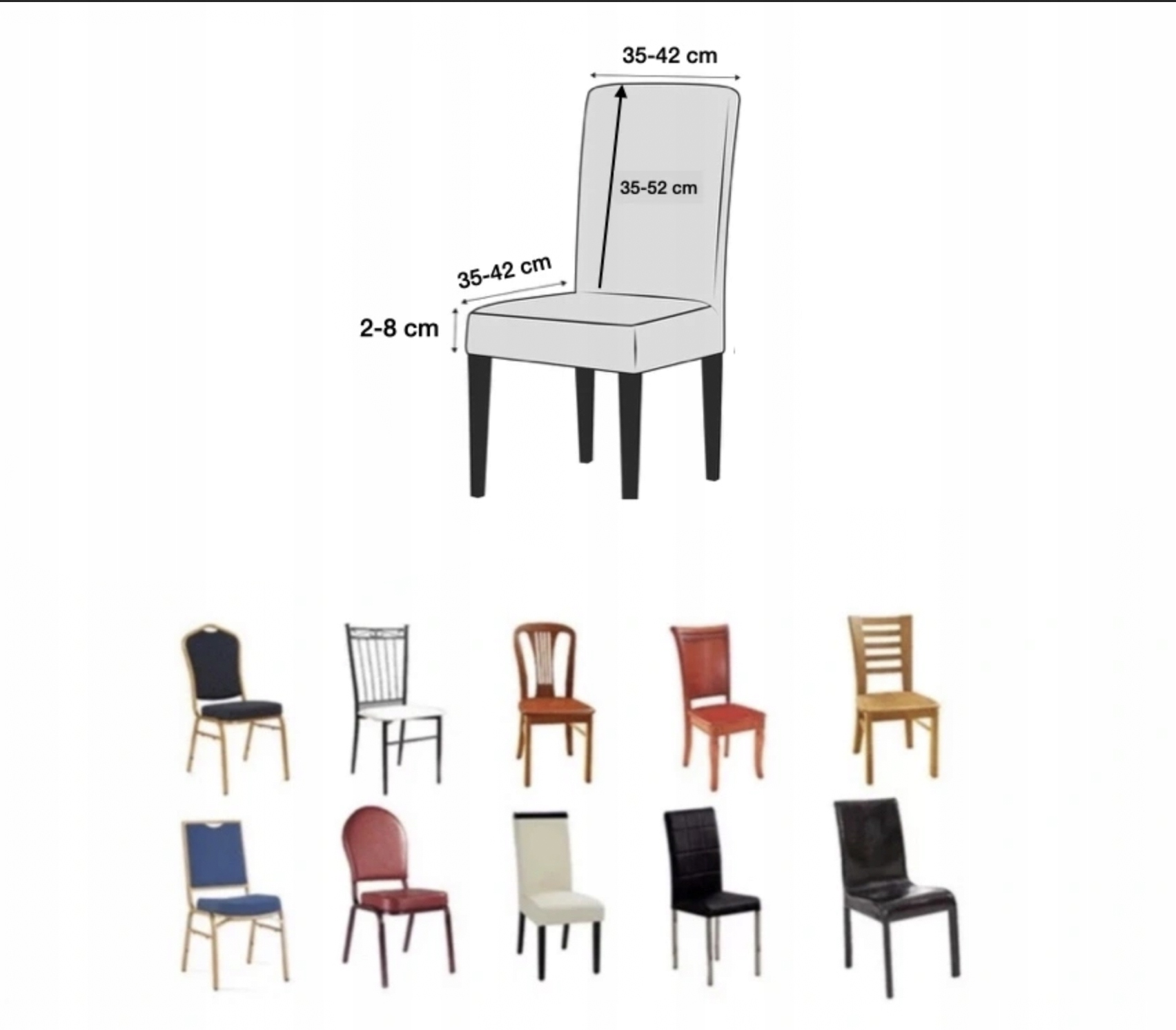 Завдяки універсальному розміру чохол ідеально підходить для більшості типів крісел. Оскільки вони гнучкі, вони легко адаптуються до стільців незвичайної форми. Чохли підходять до різних форм стільців, навіть із круглою спинкою
