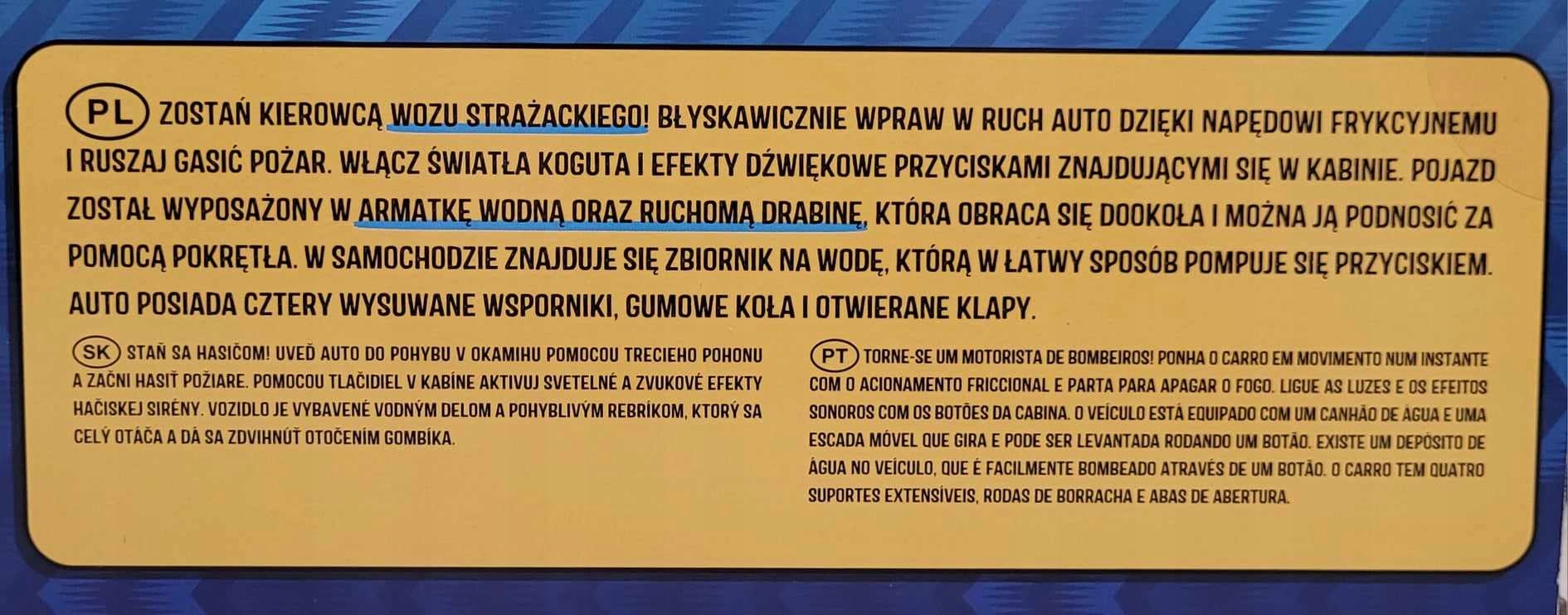 Пожежна машина — іграшка для дітей старше 3 років. Виготовлений з безпечного пластику з сертифікатами CE, він забезпечить безпечну гру для вашої дитини. Це ідеальна іграшка для хлопчиків і дівчаток, які люблять грати у пожежників. Цей транспортний засіб має світло і звук, що підвищує привабливість гри і дозволяє вам зіграти роль героя, який рятує людей, які потребують допомоги.