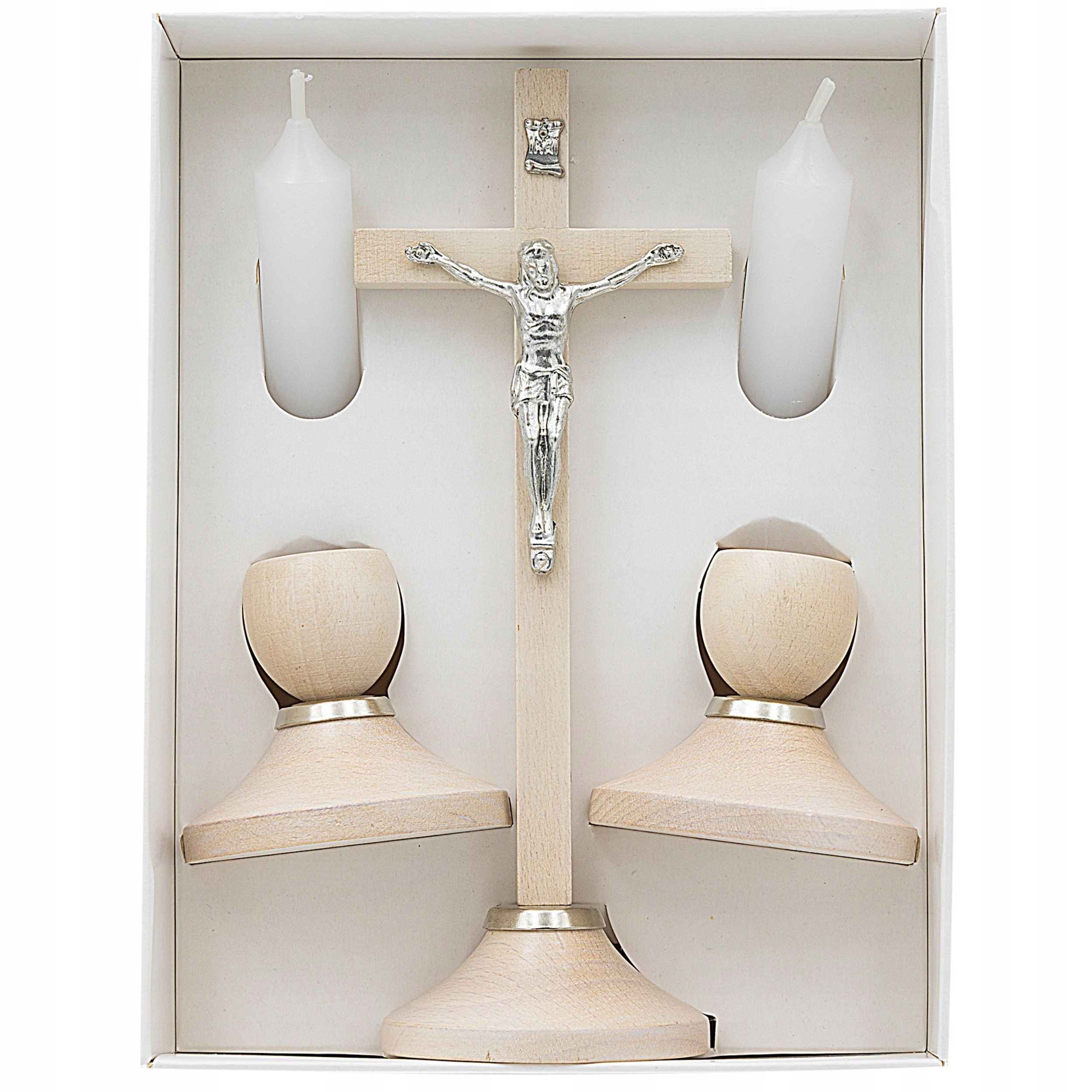 ELEGANCKI ZESTAW KOLĘDOWY Z IKONĄ Krzyż z Jezusem Jasne Drewno Świeczniki