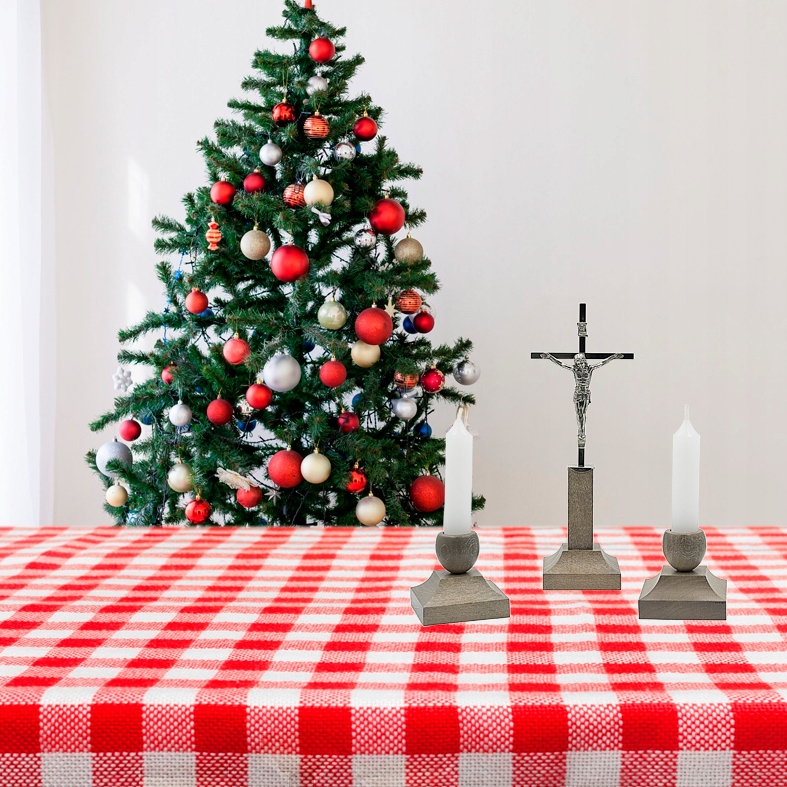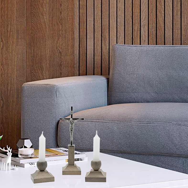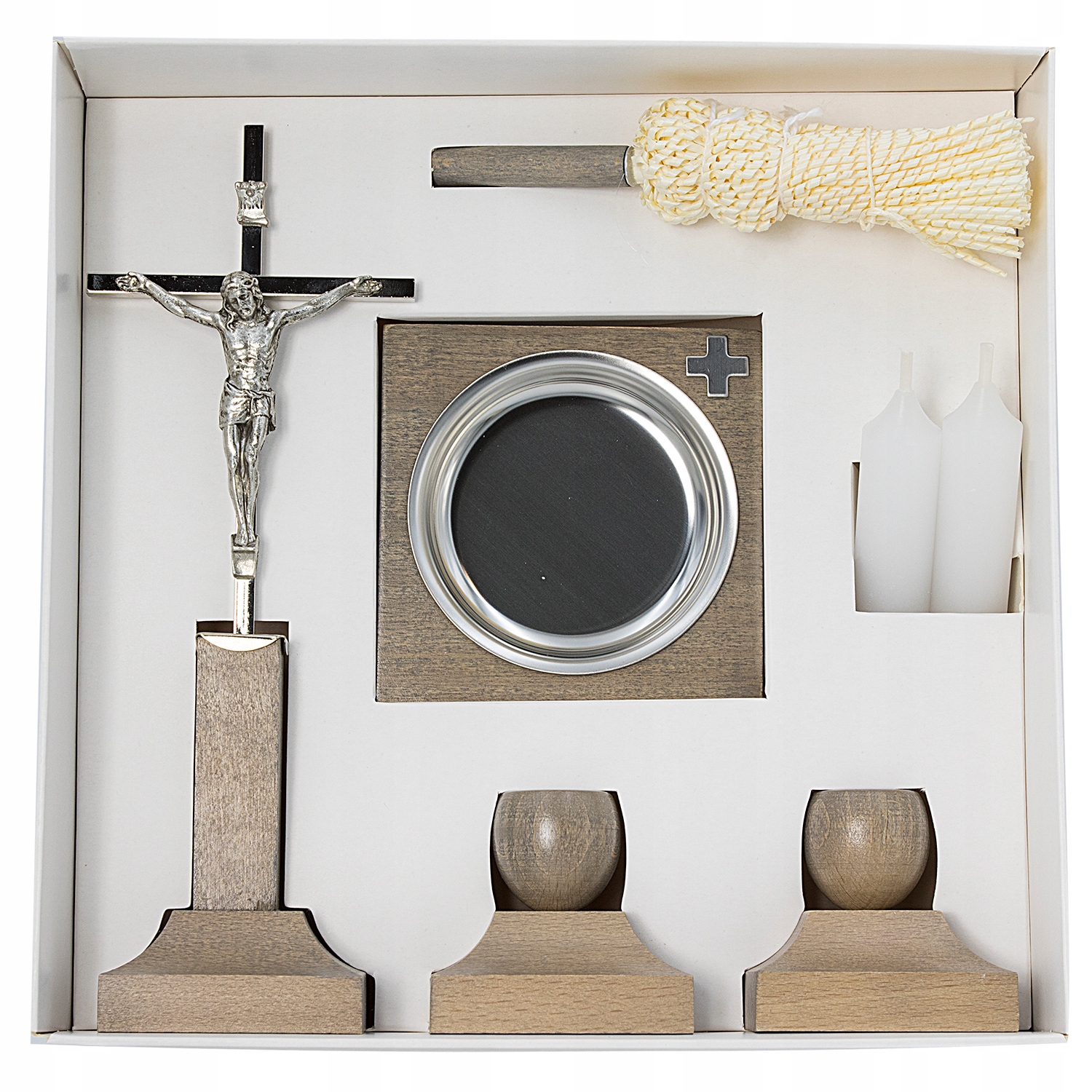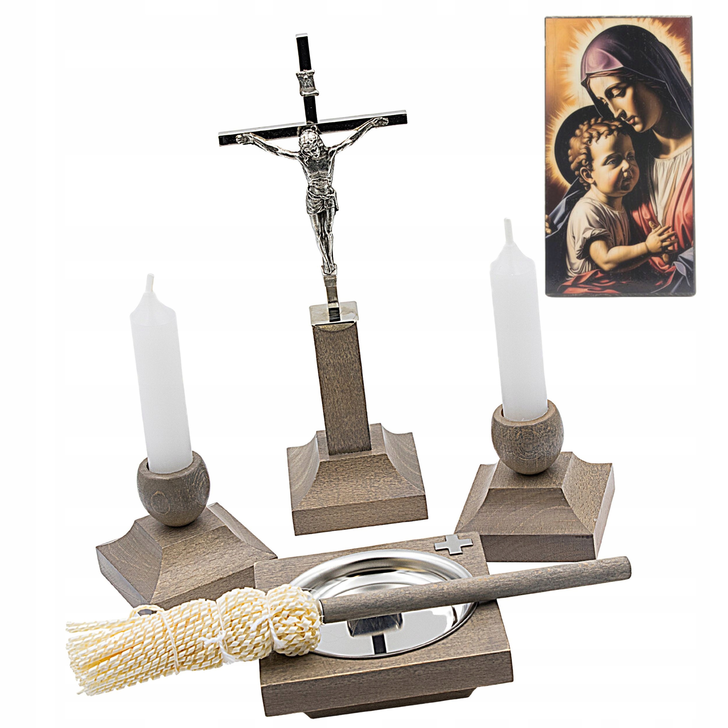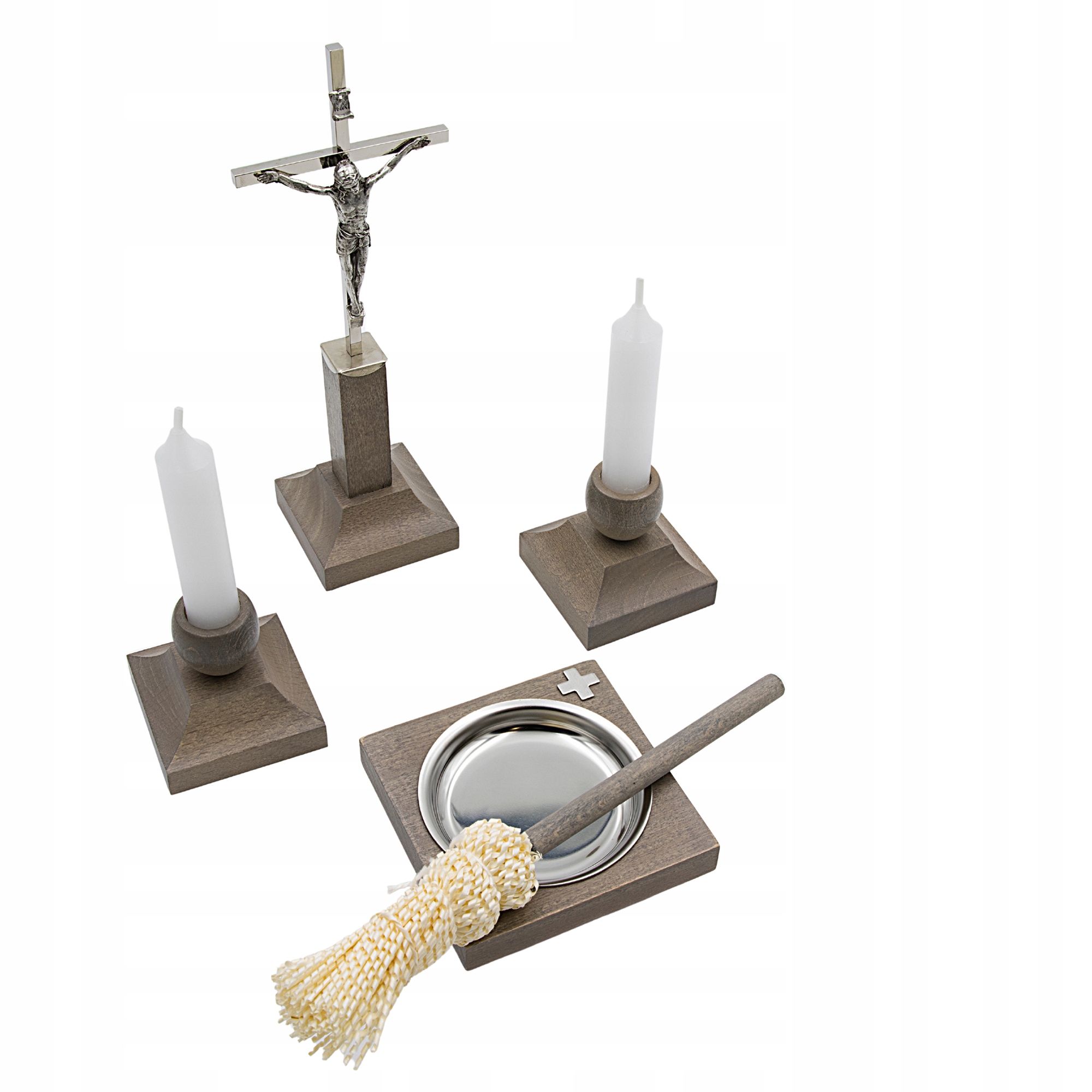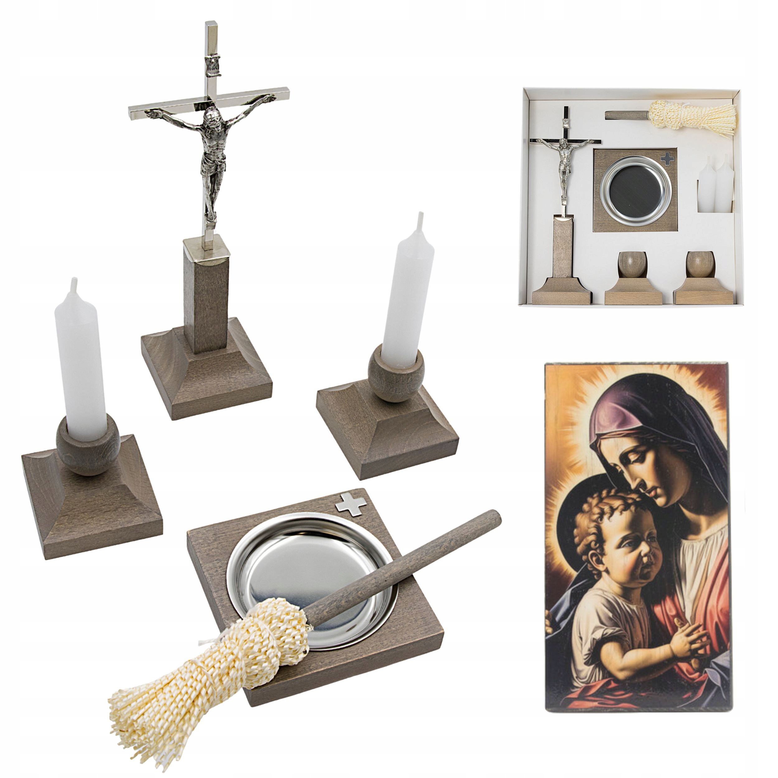 ELEGANCKI ZESTAW KOLĘDOWY Z IKONĄ Krzyż z Jezusem SZARE Drewno Kropidło