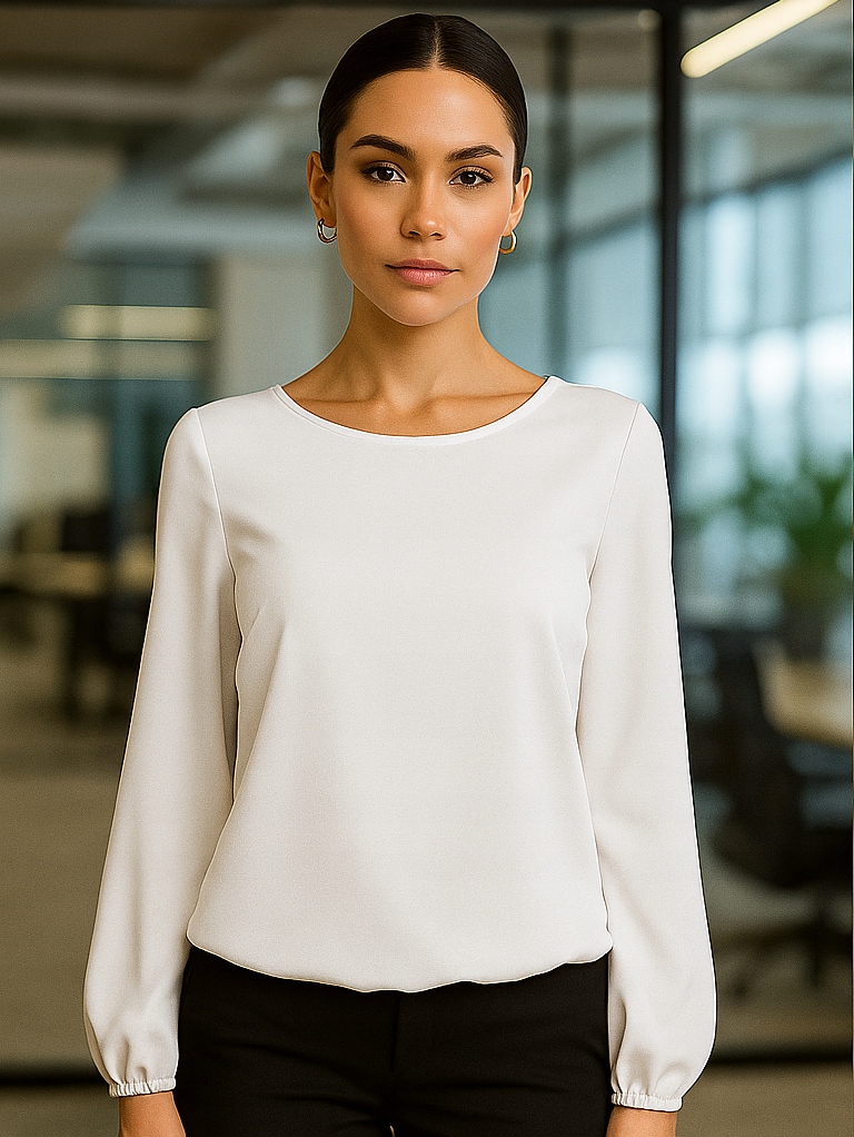 елегантній класичній білій блузці витягнута в еластичну внизу . Зроблено з приємного високої якості матеріалу . Класичний розріз буде працювати в більшості формальних стилізацій