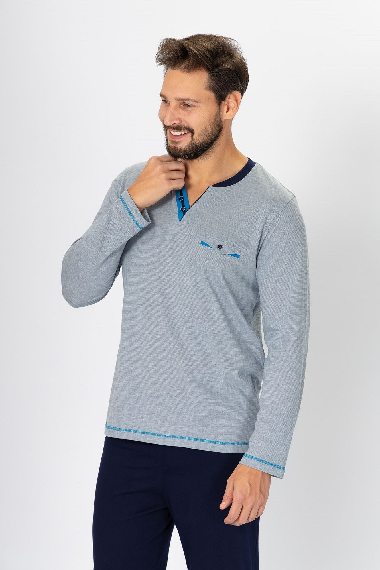 Модель довгої піжами Roch 538 відома своєю чудовою якістю та дизайном. Дуже ефектна довга чоловіча піжама - ідеальний вибір для чоловіків, які цінують елегантність і комфорт. Піжама була створена з особливою увагою до деталей і виготовлена з виключно благородної тканини «nerve», що гарантує не тільки естетичний вигляд, але й ідеальне відчуття на шкірі.