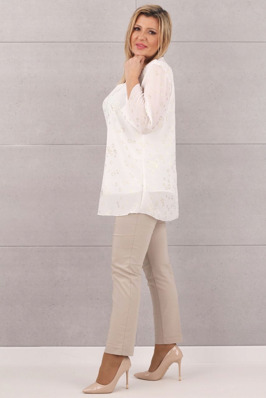 Ця шифонова блуза — це поєднання унікального дизайну та функціональності. Відмінною рисою є золоті каблучки, які прикрашають ніжний, повітряний шифоновий матеріал. Вся блузка виглядає як витончена композиція із золотистих візерунків, які створюють привабливий візерунок на тлі ніжної тканини. Він не лише випромінює делікатність та елегантність, але й забезпечує комфорт у будь-якій ситуації.