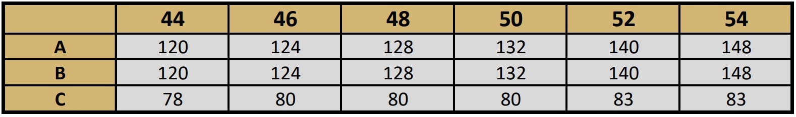 Вироби міряються плазом, назовні, застібаються на гудзики (блискавку). Розміри, наведені в таблиці, можуть відрізнятися від фактичних розмірів виробу на +/- 2 см. Модель на фото має зріст 164 см і носить розмір 48.