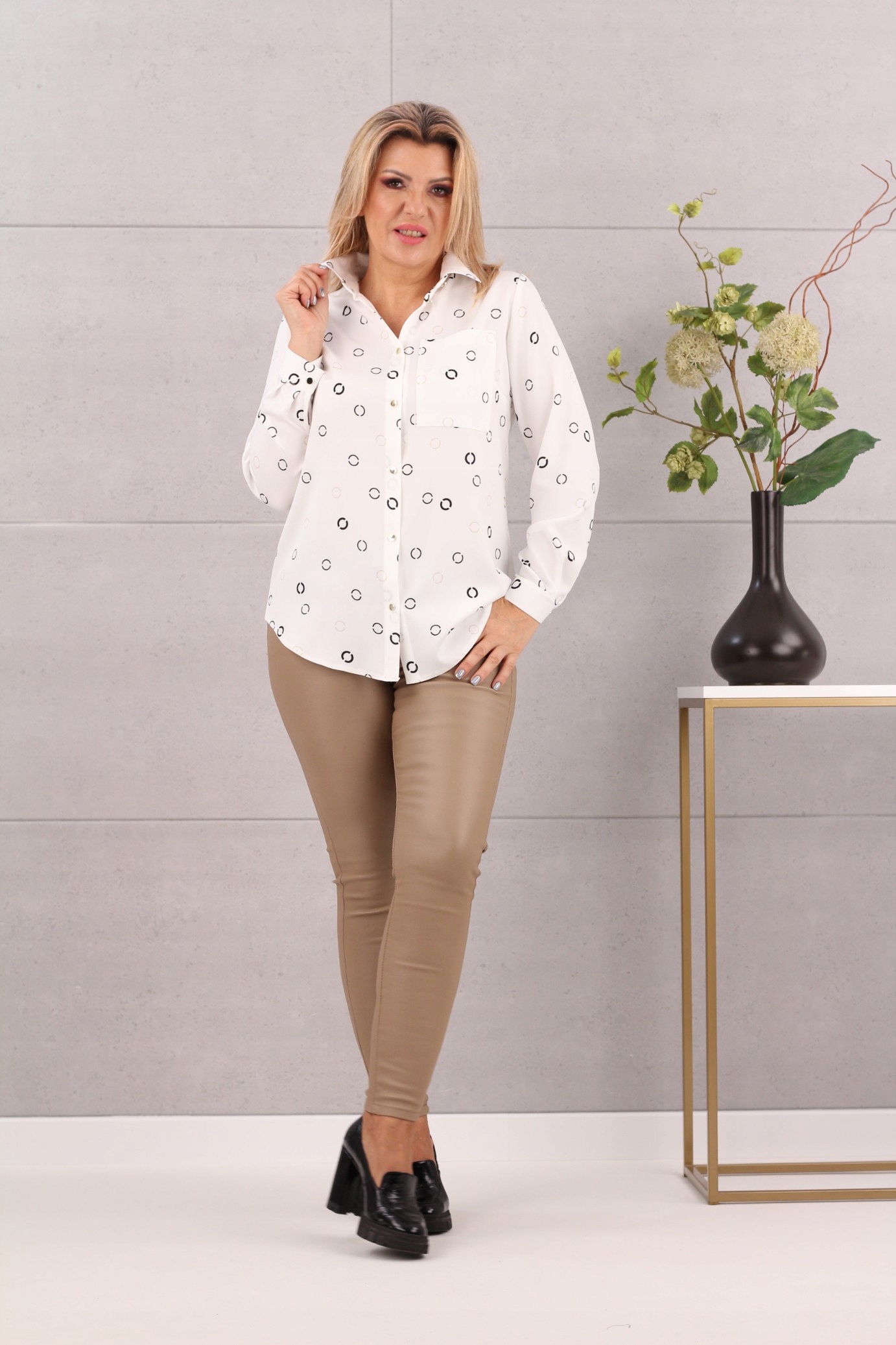 Елегантна жіноча сорочка з традиційним коміром – це стильний і незамінний елемент жіночого гардеробу. Тонкий малюнок привертає увагу, а кольори сорочки дозволяють легко поєднувати її з іншим одягом та аксесуарами. Ідеально підходить для повсякденного стилю та для особливих випадків. Ця сорочка виділить вас із натовпу та підкреслить ваш індивідуальний стиль.