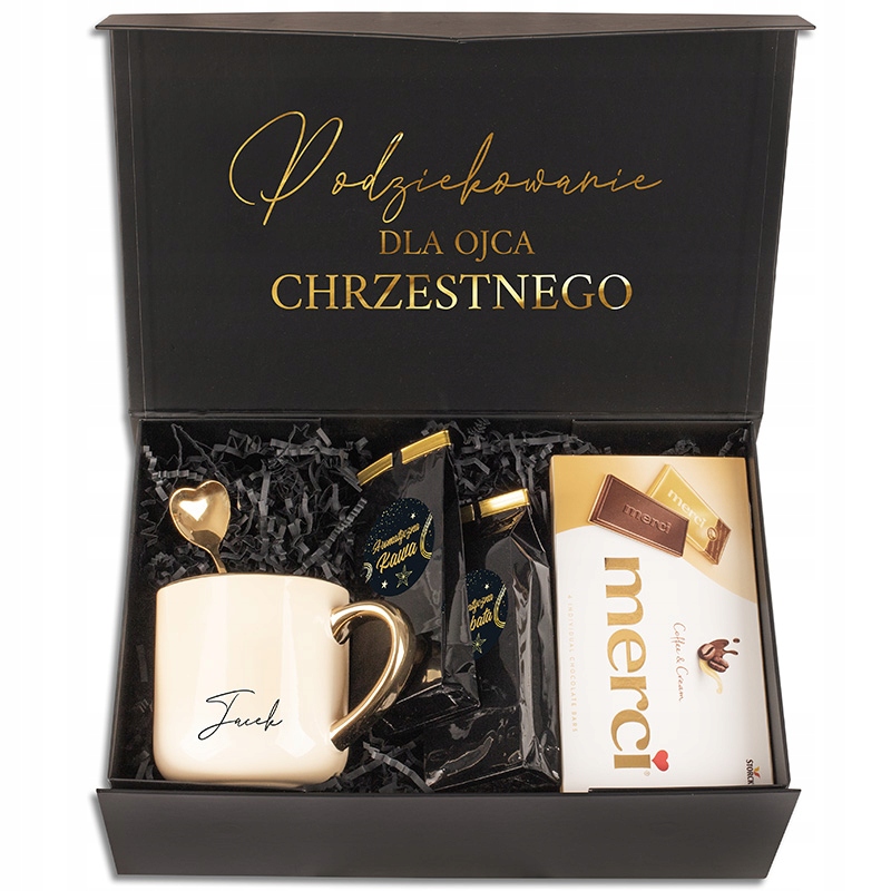 Цей унікальний набір включає чашку з персоналізованим іменем , що є як практичним, так і естетичним. Чашка була прикріплена до ароматної кави, вишуканого чаю та смачних шоколадних цукерок, які зроблять моменти розслаблення приємнішими. Ціле укладено в елегантну чорну коробку, прикрашену золотим написом , який підкреслює престижний характер подарунка.