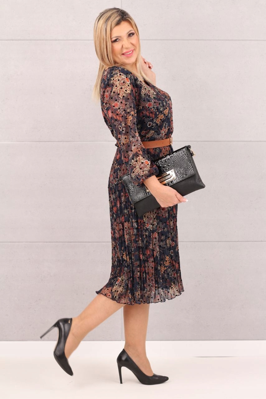 Елегантна сукня з плісированим низом - це не тільки чарівна та елегантна пропозиція, але й гарантія комфорту та зручності носіння. У комплект входить пояс, який підкреслює талію, додаючи сукні елегантності. Візерунки на сукні теплих відтінків надають їй оригінальний і привабливий вигляд. Це ідеальний вибір для багатьох випадків, коли ви хочете виглядати стильно та стильно.