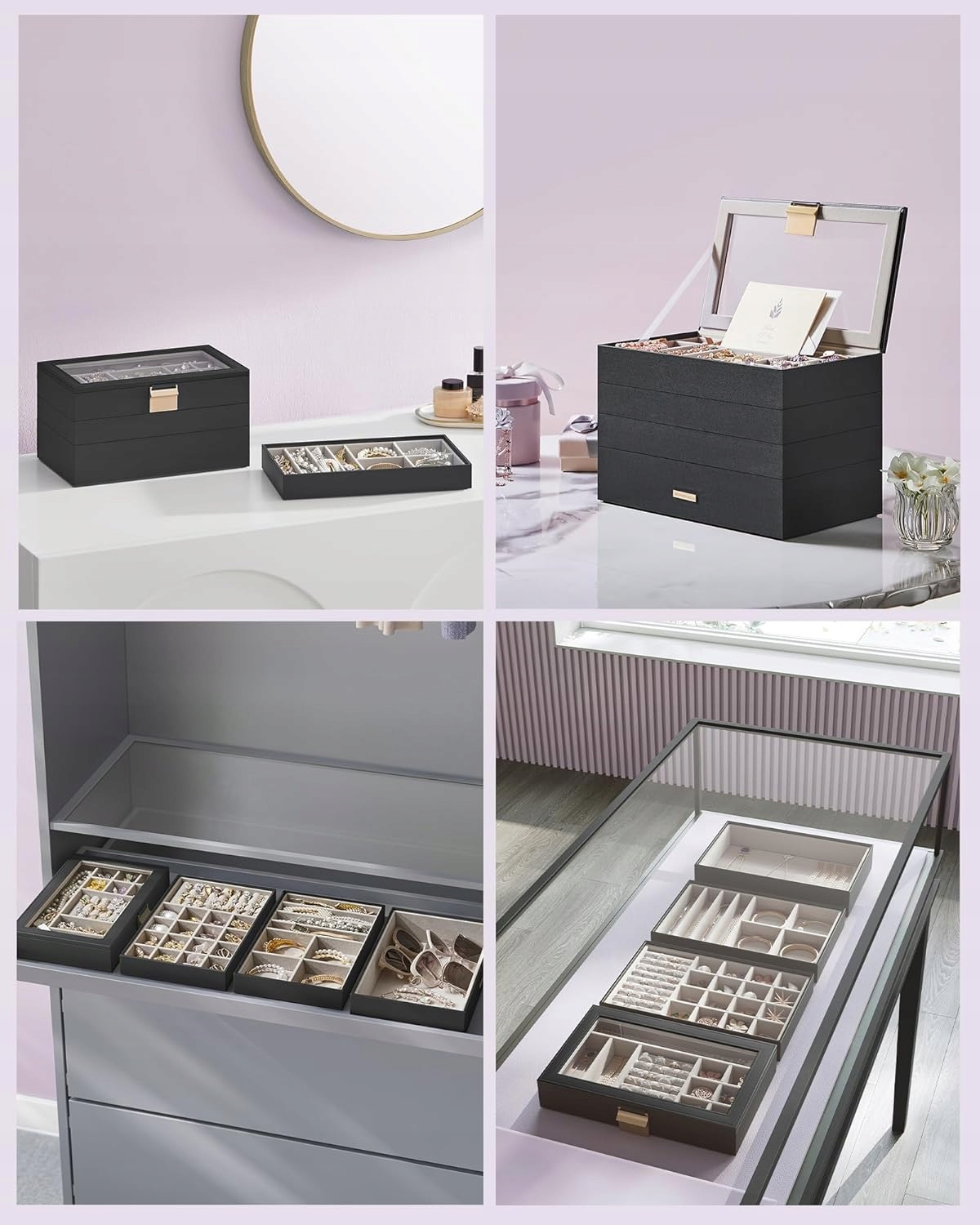Універсальність: завдяки чотирьом гнучким рівням наша скринька для коштовностей буде ідеальною як на туалетному столику в спальні, так і в ящиках або шафі. Можливість комбінування та розділення окремих рівнів дозволяє адаптувати коробку до ваших індивідуальних потреб та вподобань. Ідеальне рішення для практичного зберігання ювелірних виробів!