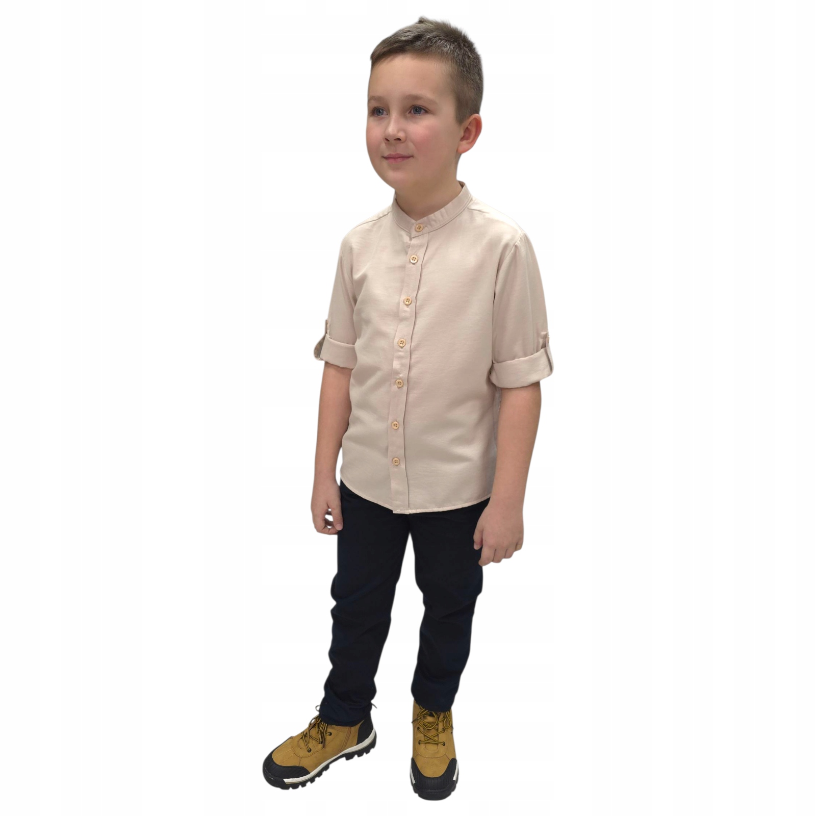 Стиль і елегантність: Елегантна бежева сорочка для хлопчика з низьким коміром-стійкою ідеально підходить для особливих випадків. Сорочка з довгими рукавами, які можна закатати до ліктів, застібається на бежеві ґудзики.