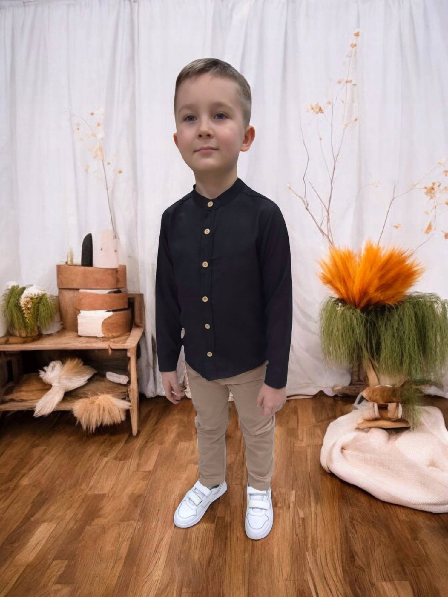 Стиль і елегантність: елегантна чорна сорочка для хлопчика з низьким коміром-стійкою, ідеальна для особливих випадків. Сорочка з довгими рукавами, застібається на бежеві ґудзики, додає шику будь-якому стилю.