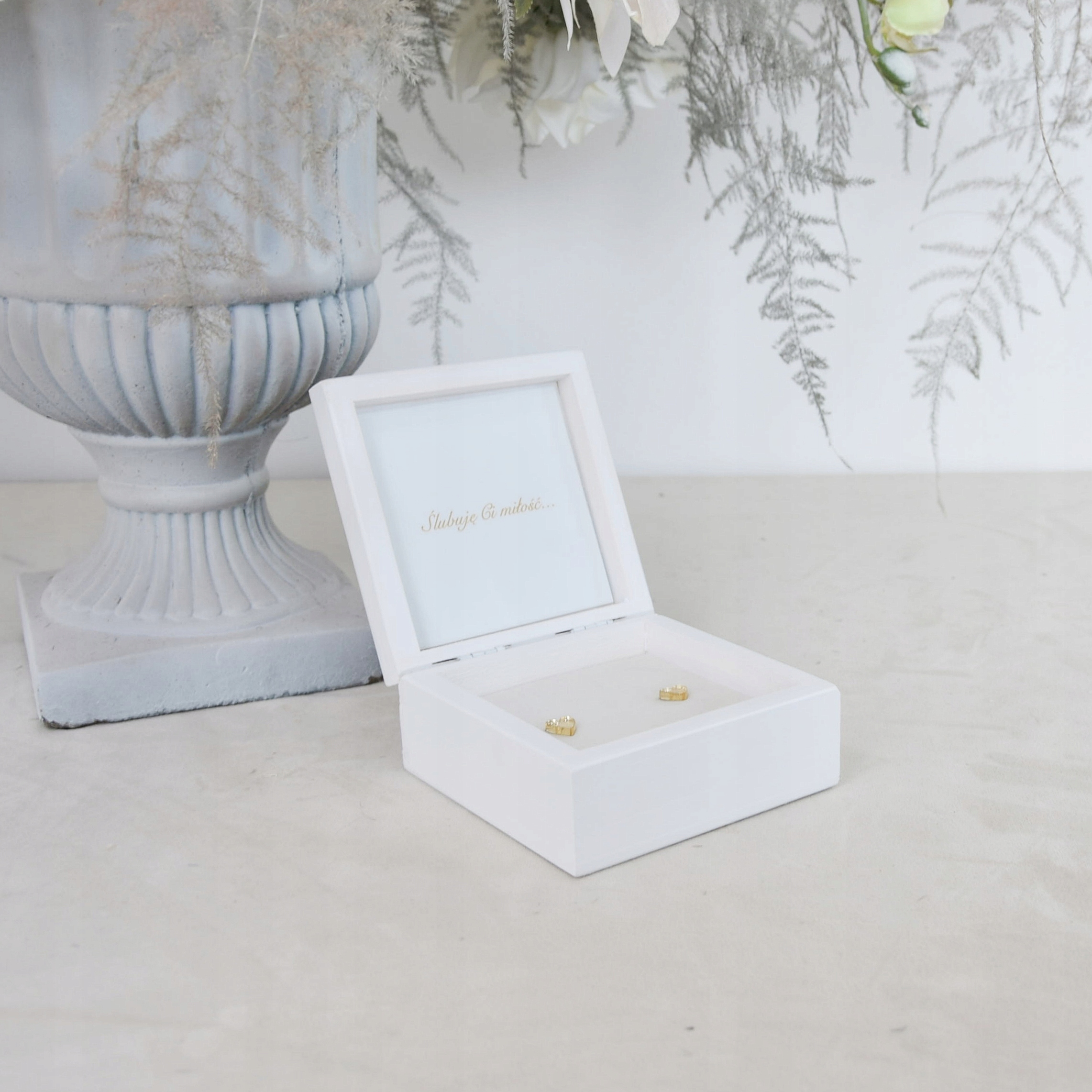 Наша скринька, створена для найважливішого дня вашого життя, поєднує витонченість білого кольору з блиском золотих ініціалів. Це поєднання створює гармонійну та розкішну естетику, яка додасть неповторного шарму та елегантності вашій весільній церемонії.