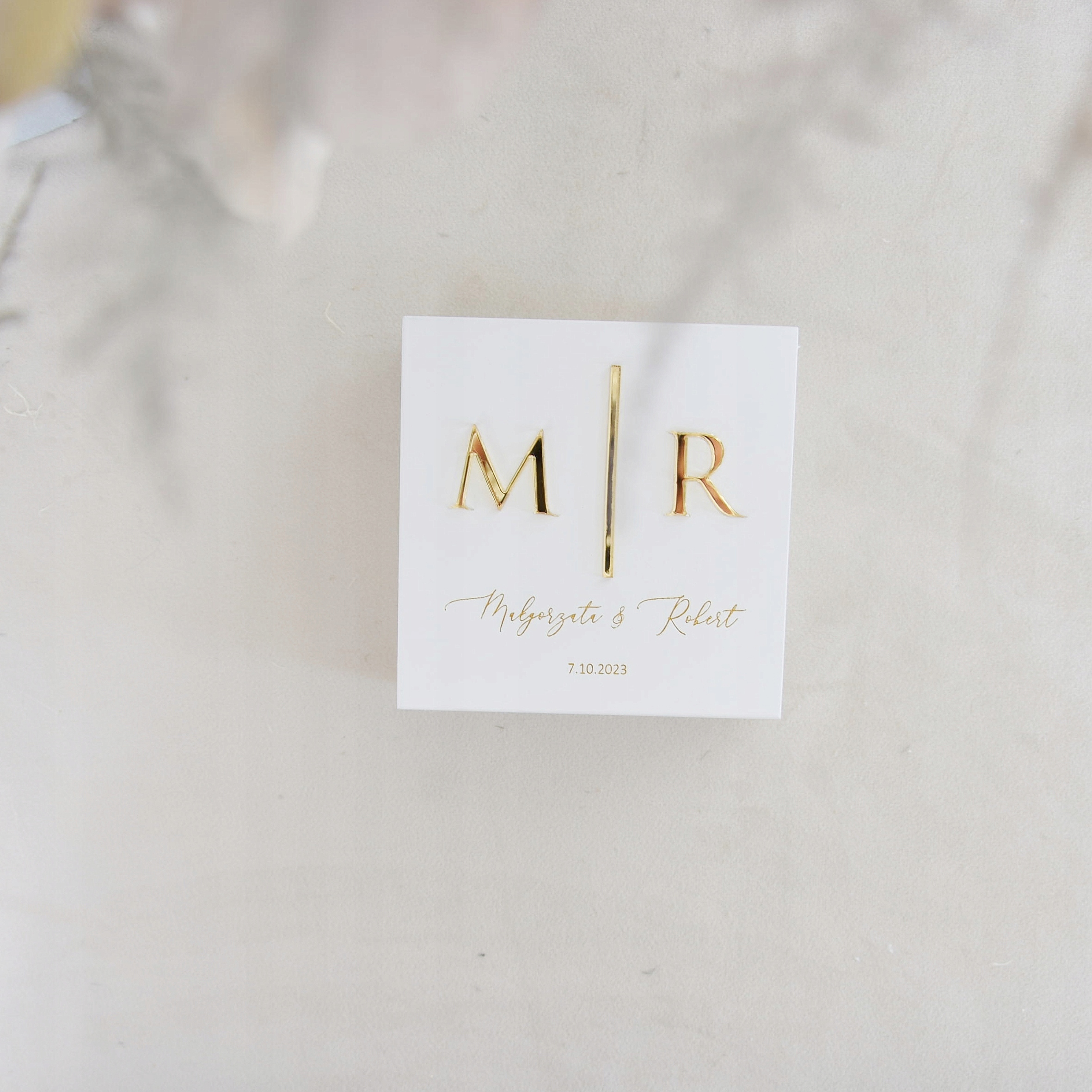 Представляємо білу весільну коробку-конверт із золотими ініціалами - справжню перлину, яка додасть неповторного шарму та розкішного акценту Вашій весільній церемонії.