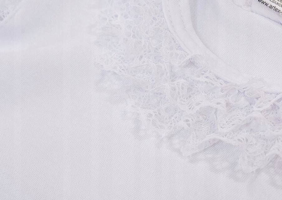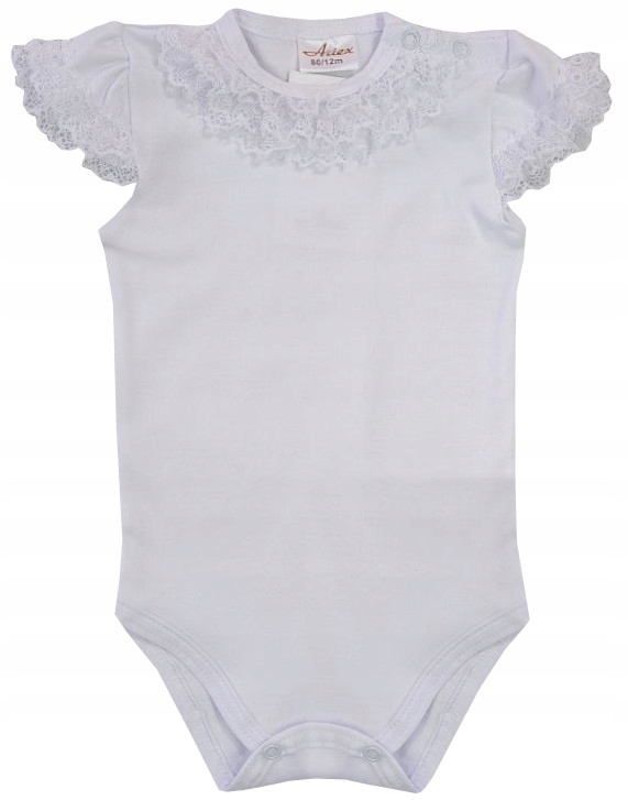 вирізати : короткі рукави тіла, закріплені засувками на плечі та в промежині. На шиї та рукавах, красиво прикрашений мереживом.