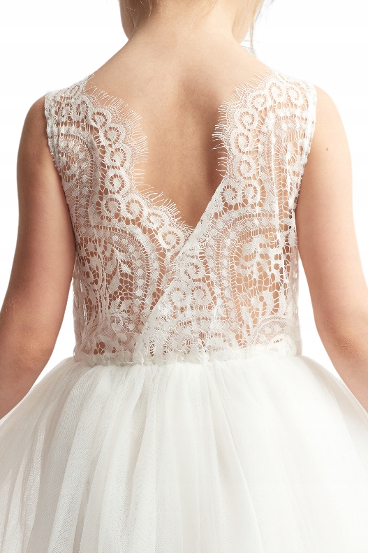 Перевага цієї сукні - це його легкий зовнішній вигляд та красиві шари довгого тюлю, які надають йому обсягу та легкість. Передня частина тулуба з білим без рукавів у поєднанні з квітковим мереживом надає цій сукні чарівності та витонченість. Сукня для дівчат Tulle Liv Biel - це чудовий вибір для причастя, весіль, хрещення, а також інших важливих сімейних урочистостей. Підкресліть делікатну красу вашої дитини та вкладіть у цю надзвичайно чарівну сукню.