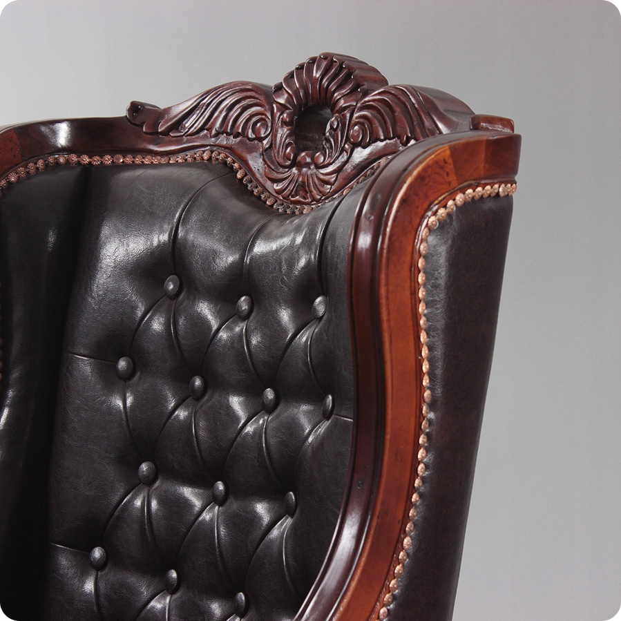 Клас - ваше друге ім'я, а вашому офісу потрібна трохи свіжої елегантності? Це ідеально, тому що в нашій пропозиції є те, що виправдає ваші очікування! Представляємо дерев'яне крісло в античному стилі! Меблі ручної роботи з масиву дерева. Оздоблений високоякісною екологічною шкірою. Весь він представлений в темних тонах, за винятком того, що дерево має темний, горіховий відтінок, а оббивка дуже темно-коричнева. Такі кольори чудово підкреслюють декоративне різьблення, виконане по дереву.