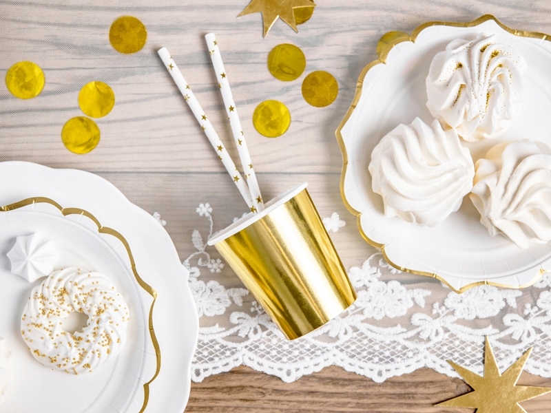 Одноразовий посуд також може бути елегантним. Чашки золотого кольору виглядають надзвичайно елегантно, тому ми можемо використовувати їх під час причастя, весілля чи вечірки в саду, а прибирання буде швидким і приємним.