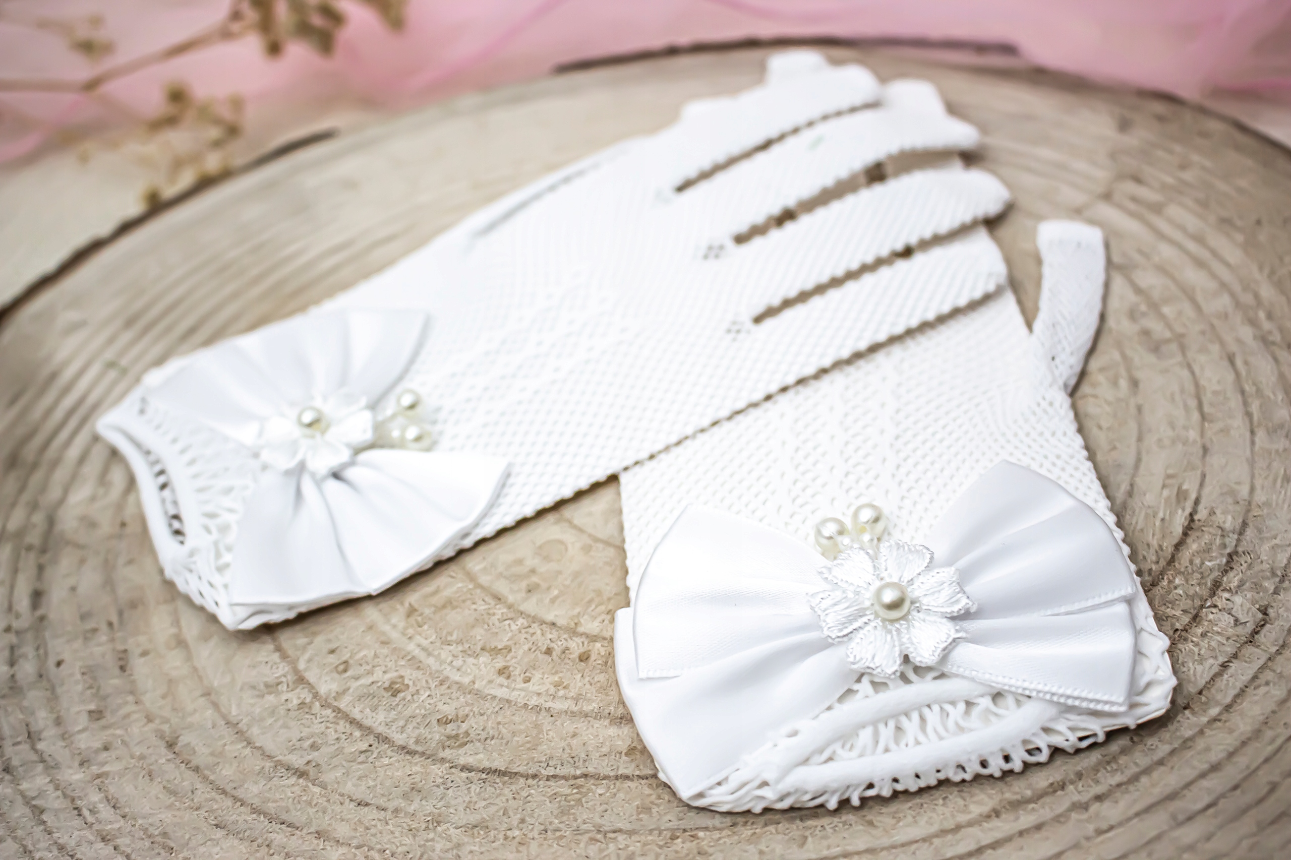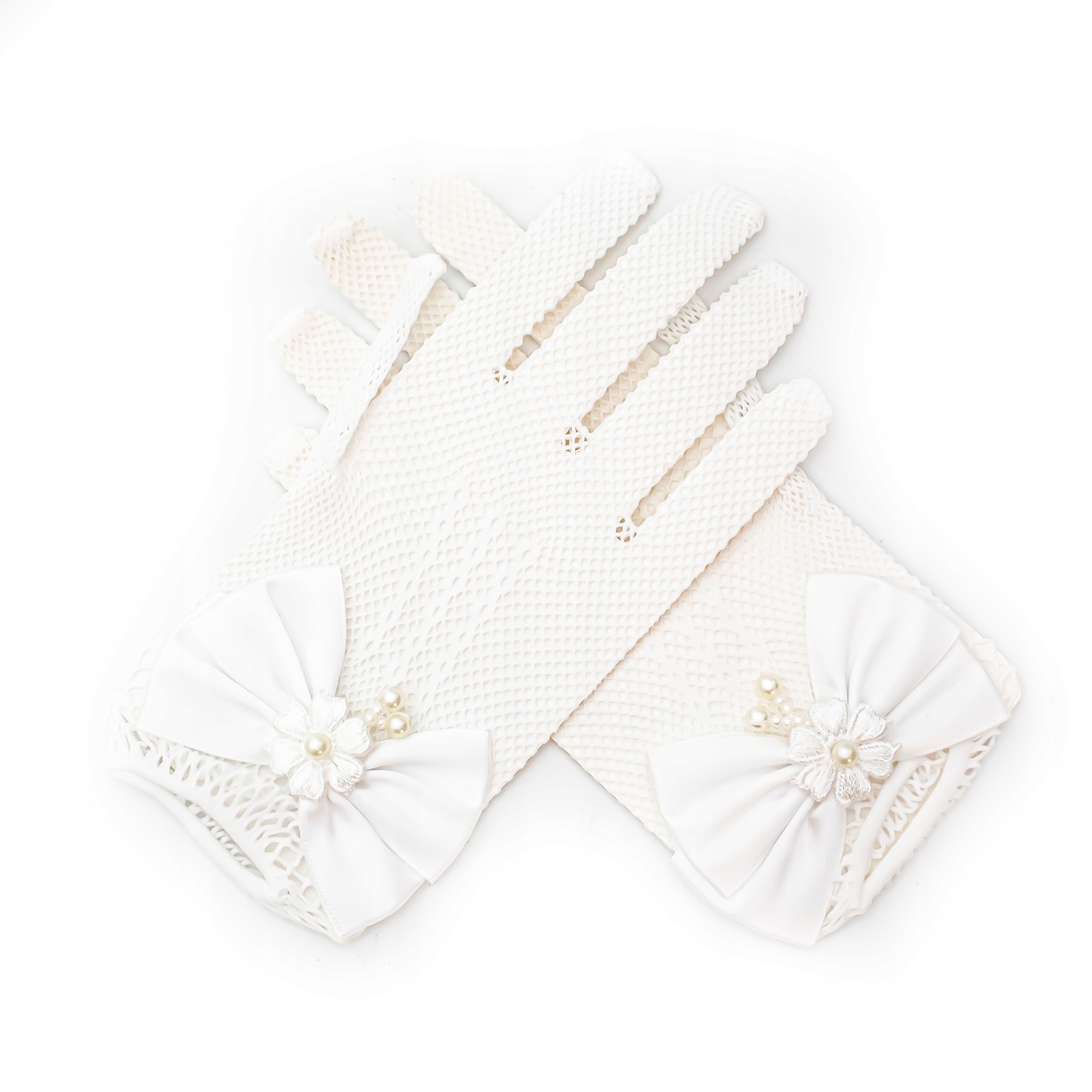 Чарівні, білі рукавички для дівчини, ідеальні для першого Святого Причастя та інших святкувань. Зроблено з ніжного мережива, прикрашеного тонким луком з перлами. Додасть елегантності до будь -якої стилізації.