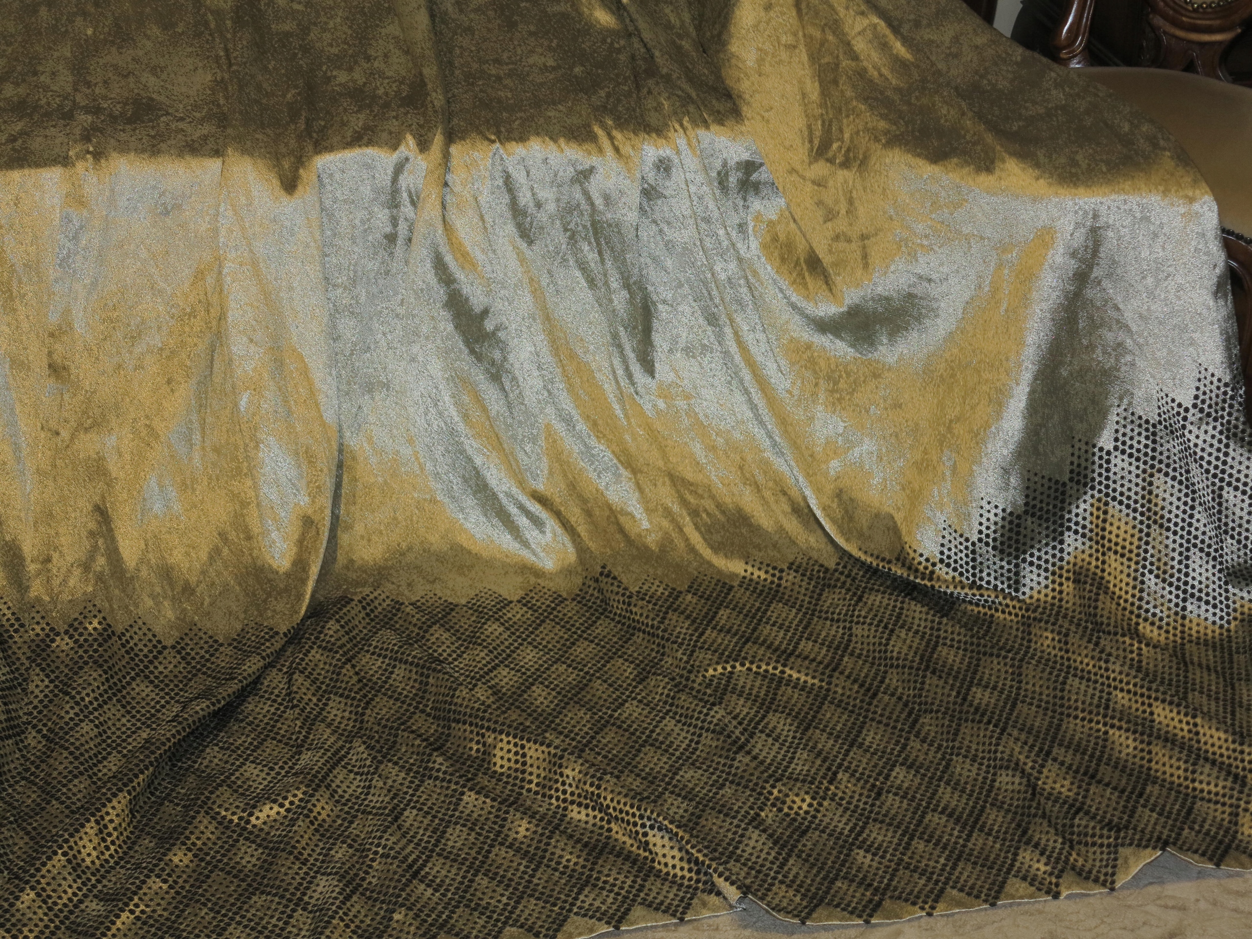 Тема аукціону - це набір красивих штор у срібному мерехтіннях із золотом та чорний широкий візерунок. Дно штор чорні. Розміри однієї завіси: довжина 238 см+4 см вгору, ширина 175 см. Використовується, в супер хорошому стані.
