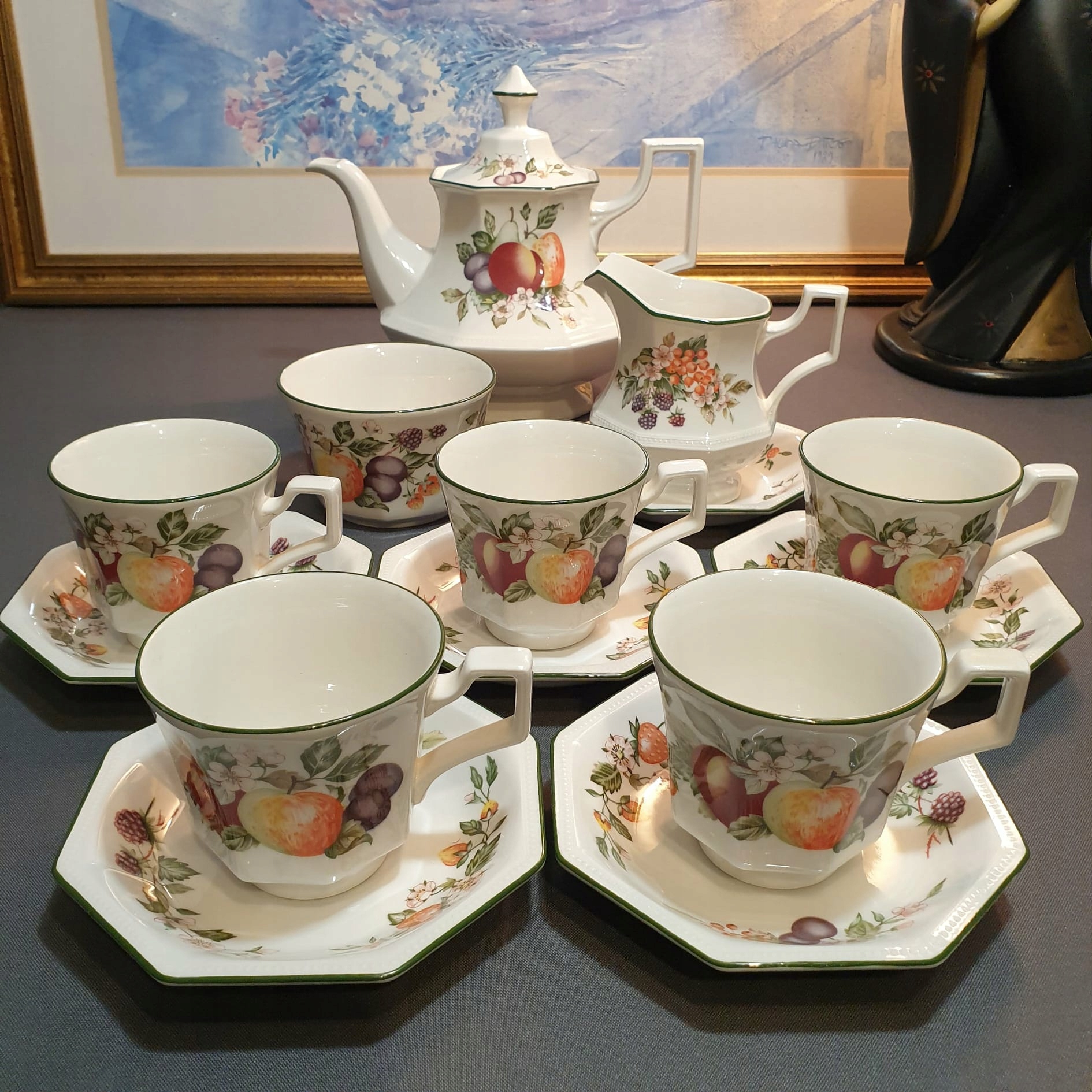 Чудовий, класичний чайний сервіз, виготовлений в Англії, у незмінному стилі з тонким фруктовим мотивом і ніжною зеленою окантовкою. Порцеляна виглядає надзвичайно елегантно та прикрасить будь-який стіл - як щодня, так і в особливих випадках.