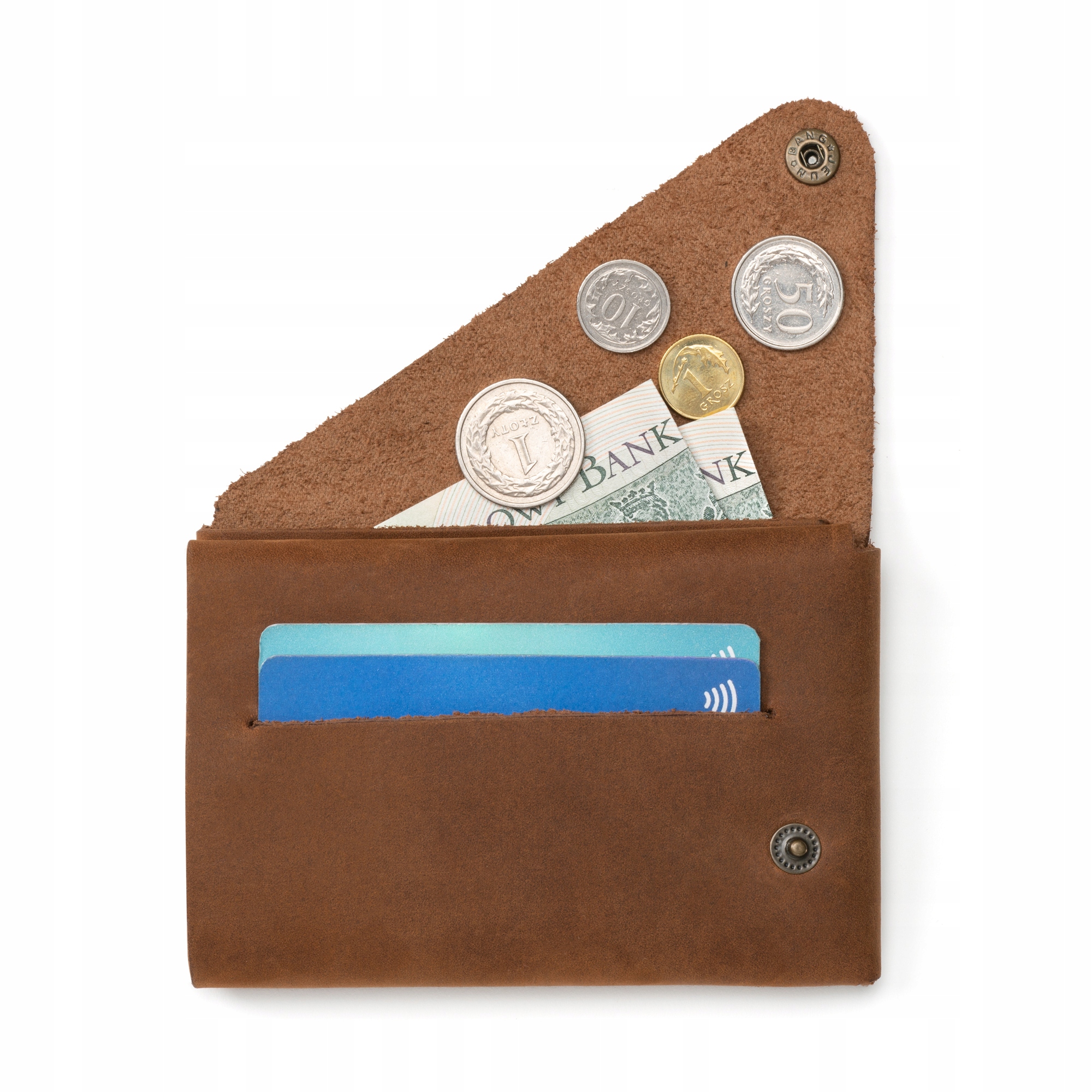 Гаманець має 2 кишені для карток і місце для монет.