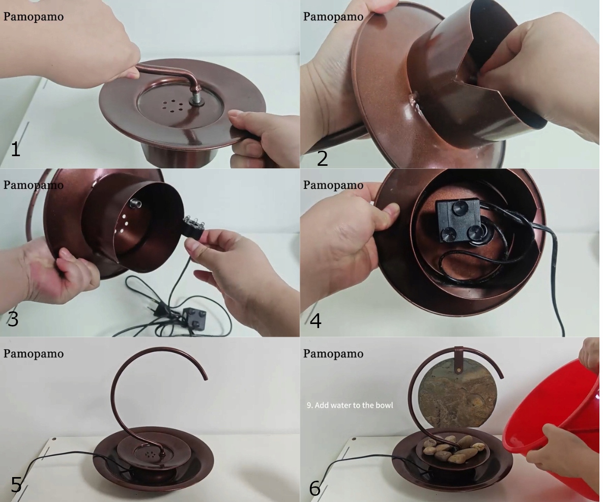 - Настільний фонтан має простий інтуїтивно зрозумілий процес встановлення. Просто прикрутіть тропічний душ до основи. Встановіть насос і світлодіоди відповідно до отворів знизу. Викласти в миску і налити воду. У набір входить насос зі світлодіодним підсвічуванням, який постійно забезпечує циркуляцію води. Після монтажу підключіть шнур живлення і у вас вийде гарний фонтан. (Переконайтеся, що в басейні достатньо води, щоб уникнути проблем із витоком води та надмірним розбризкуванням.)