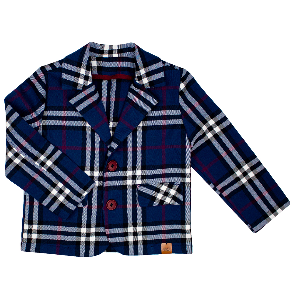 Дитяча кофта з дуже м'якої та зручної тканини з вовною. Піджак для хлопчика має контрастні ґудзики бордового кольору в тон, декоративні вкладки та стильну відстрочку на рукавах. Типовий комір з V-подібним вирізом, оздоблений елегантною окантовкою всередині, також ідеально поєднується за кольором із картатим візерунком. Піджак у клітку від Lukrencja має шкіряну бирку з логотипом. Це 100% польський продукт.
