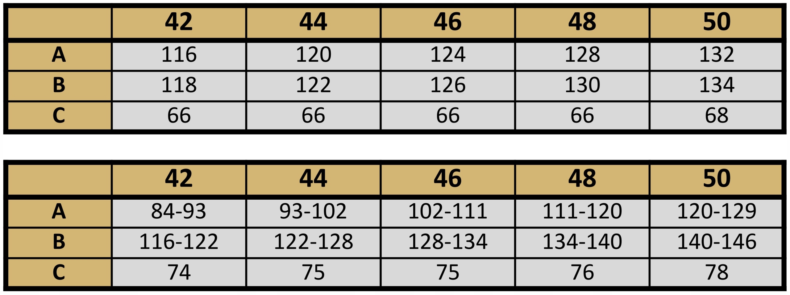 B – Обхват стегна (вимірювання, наведене в таблиці, є діапазоном, коли матеріал розтягується)