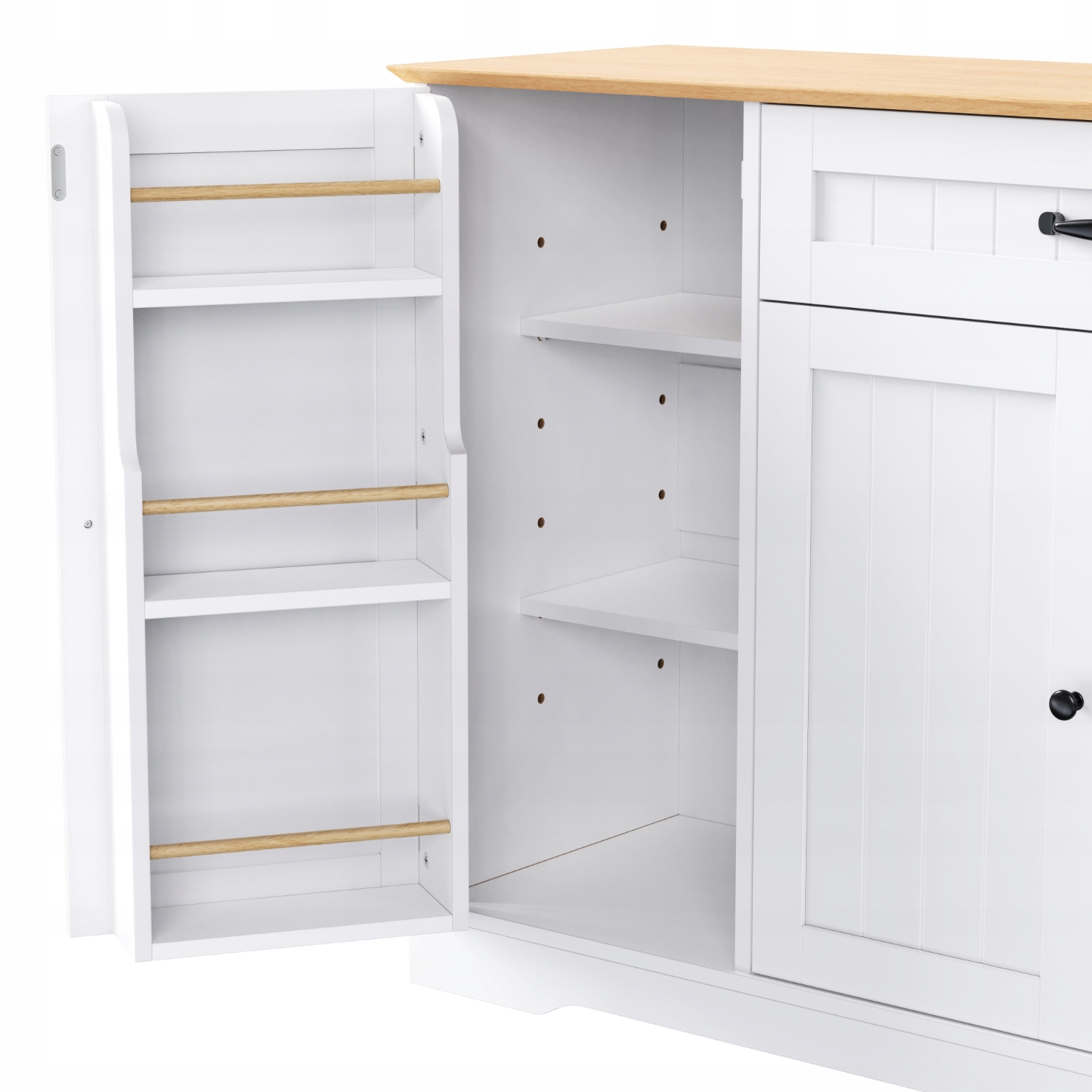 - Впорядковане зберігання: Дверцята шафи в стилі холодильника зліва мають розсувні напрямні для напоїв у пляшках, книг та інших речей; всередині три полиці з можливістю регулювання висоти. У верхньому ящику можна зберігати ключі та прикраси. Дводверна шафа праворуч має регульовані полиці, які пропонують гнучкий простір для зберігання, дозволяючи підтримувати кімнату охайною та організованою.