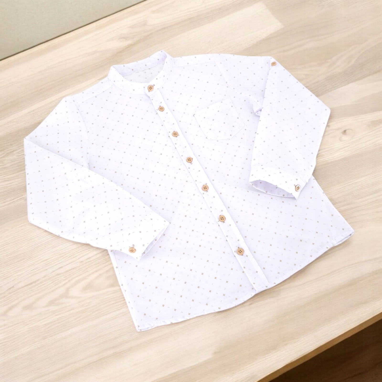 Елегантна біла сорочка для хлопчика з ніжним малюнком з низьким коміром-стійкою, ідеально підходить для особливих випадків. Сорочка з довгими рукавами приталеного крою додає елегантності будь-якому стилю.