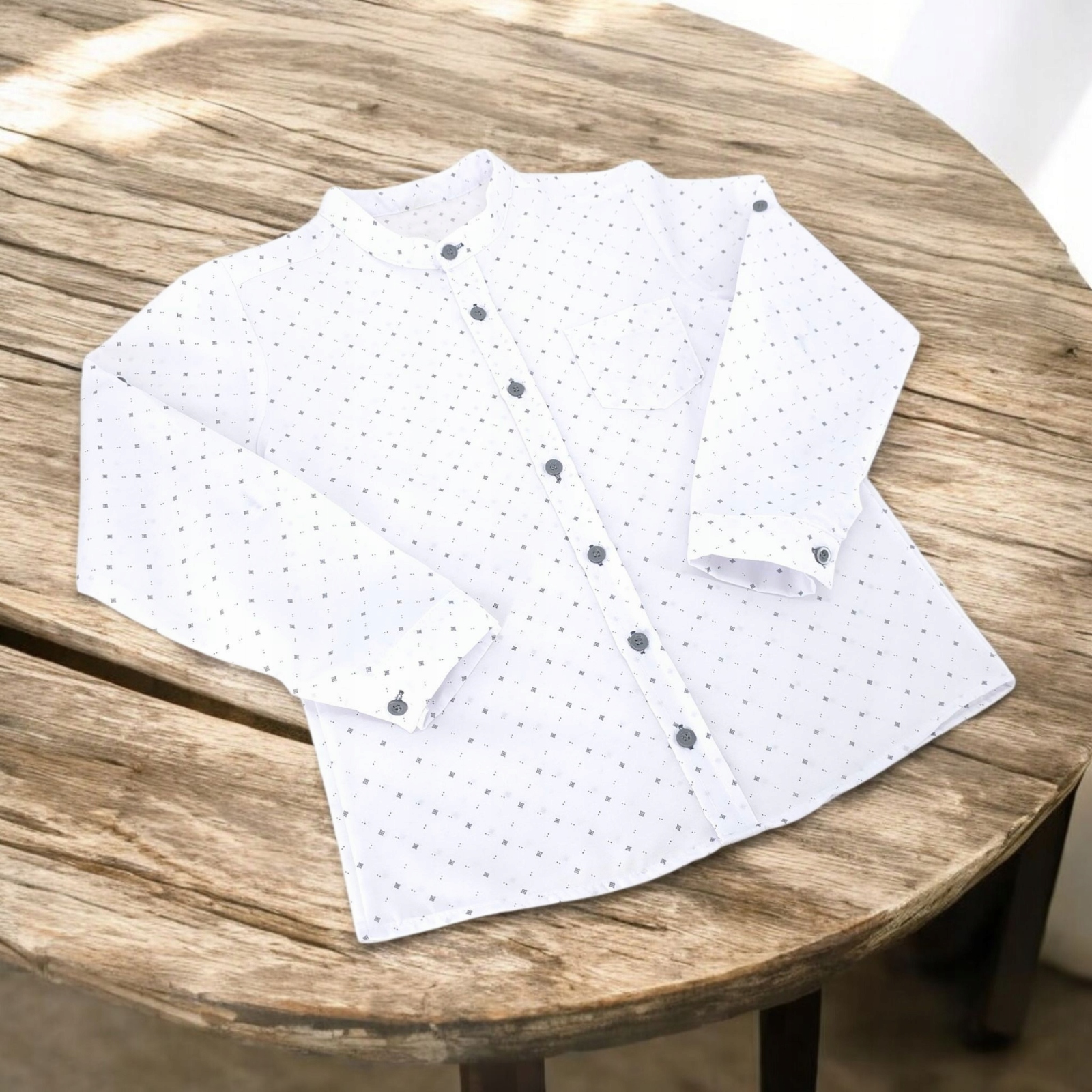 Елегантна біла сорочка для хлопчика з ніжним малюнком з низьким коміром-стійкою, ідеально підходить для особливих випадків. Сорочка з довгими рукавами приталеного крою додає елегантності будь-якому стилю.