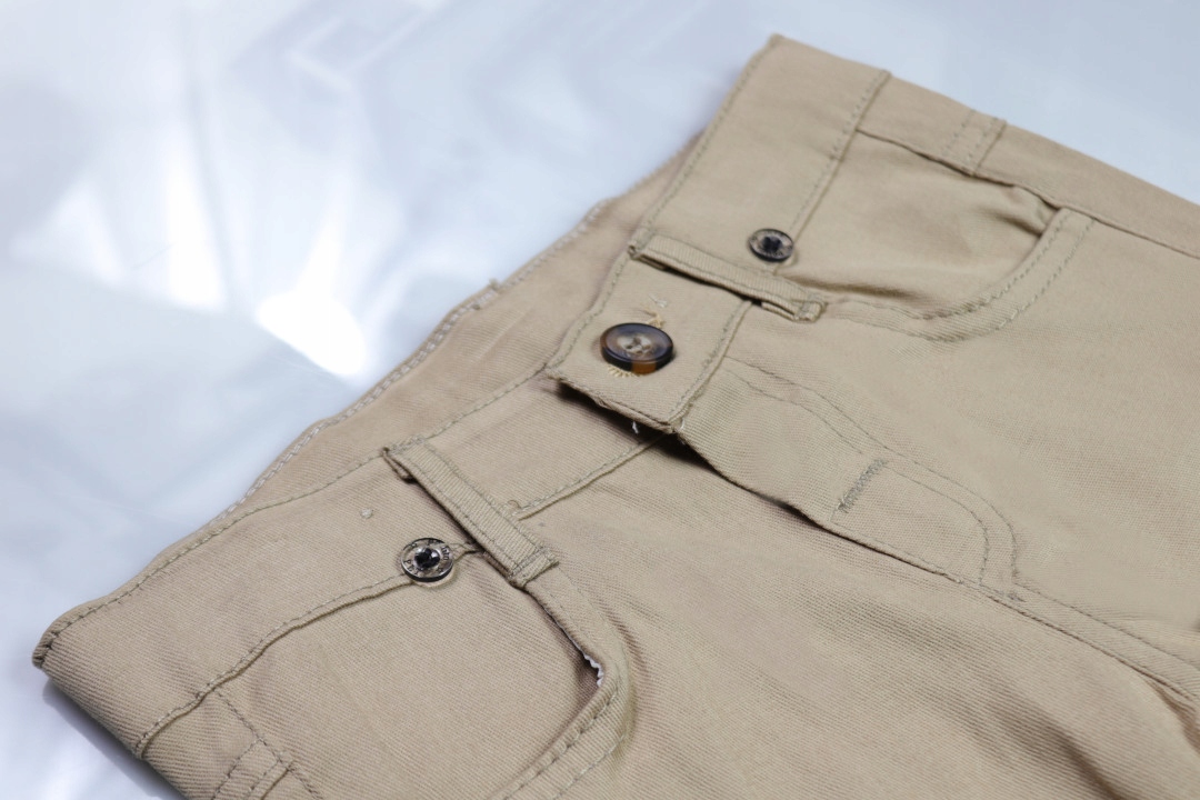 Штани бежевого кольору, застібаються на ґудзики. Мають дві кишені спереду і ззаду. Всередині мають регульовані гумки.