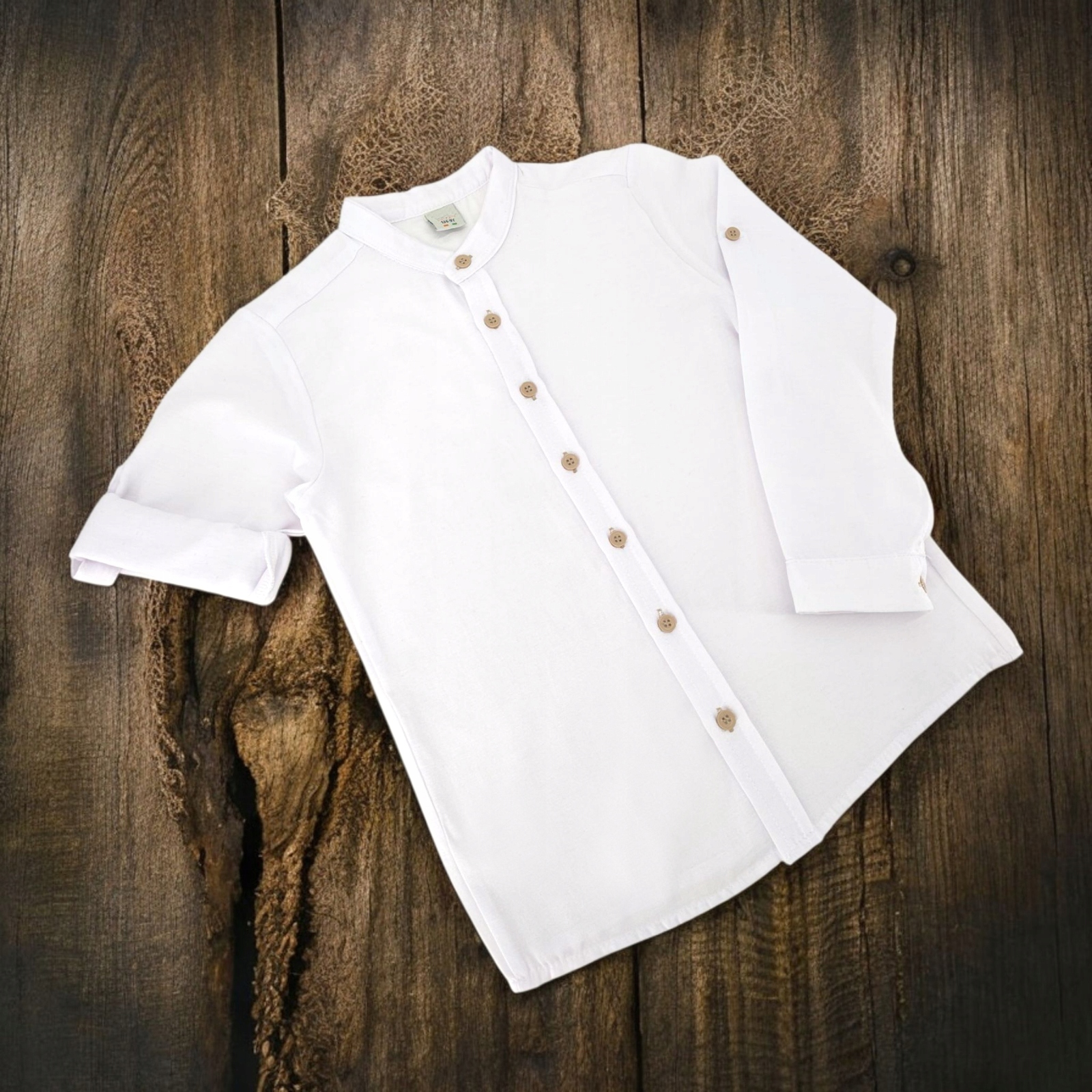 Елегантна біла сорочка для хлопчика з низьким коміром-стійкою, ідеальна для особливих випадків. Сорочка з довгими рукавами додає елегантності будь-якому стилю.