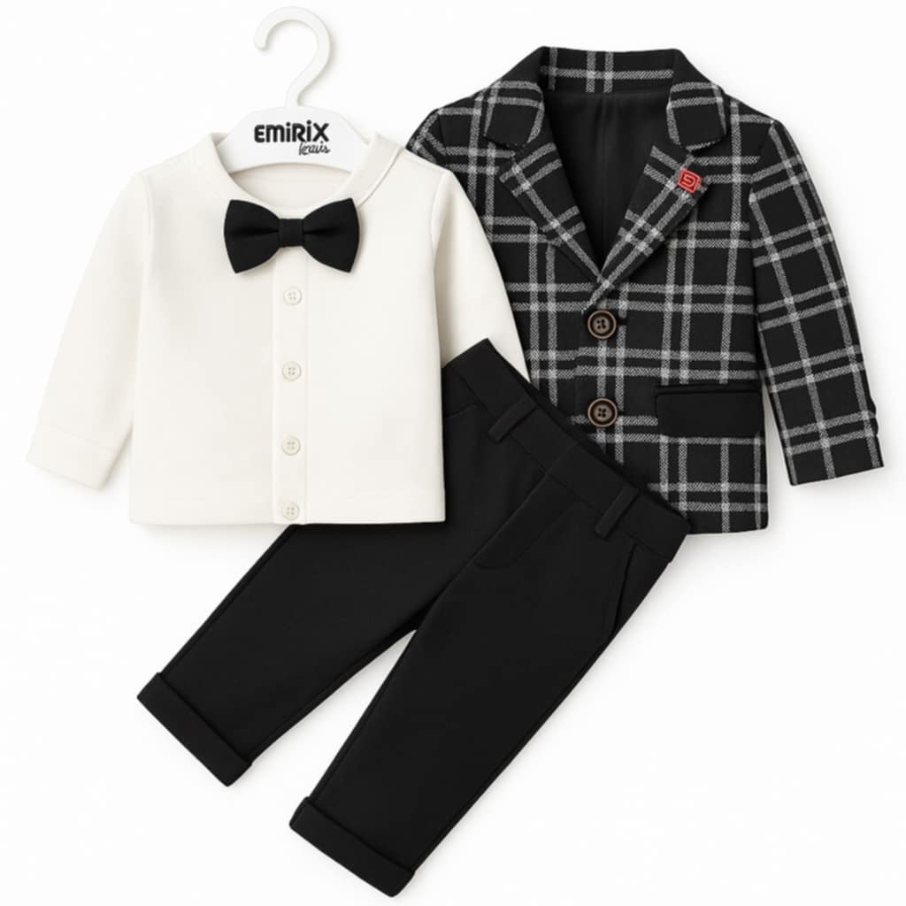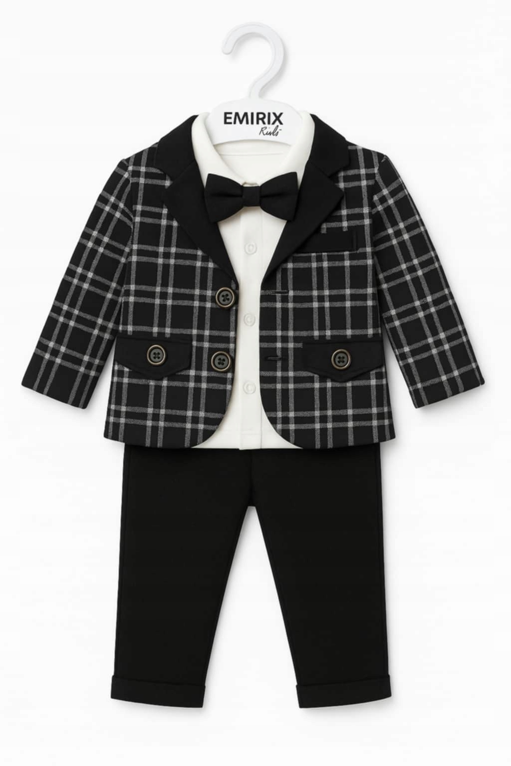 Елегантний чотиристоронній костюм для хлопчика, що ідеально підходить для спеціальних випадків. Набір включає тріснучу куртку, сорочку з краваткою на еластичній смузі та чорними штанами. Набір, виготовлений з м'якого, шкірного матеріалу, забезпечує комфорт та свободу руху. Це чудовий вибір для хрещення, свят, весілля чи фотосесії.
